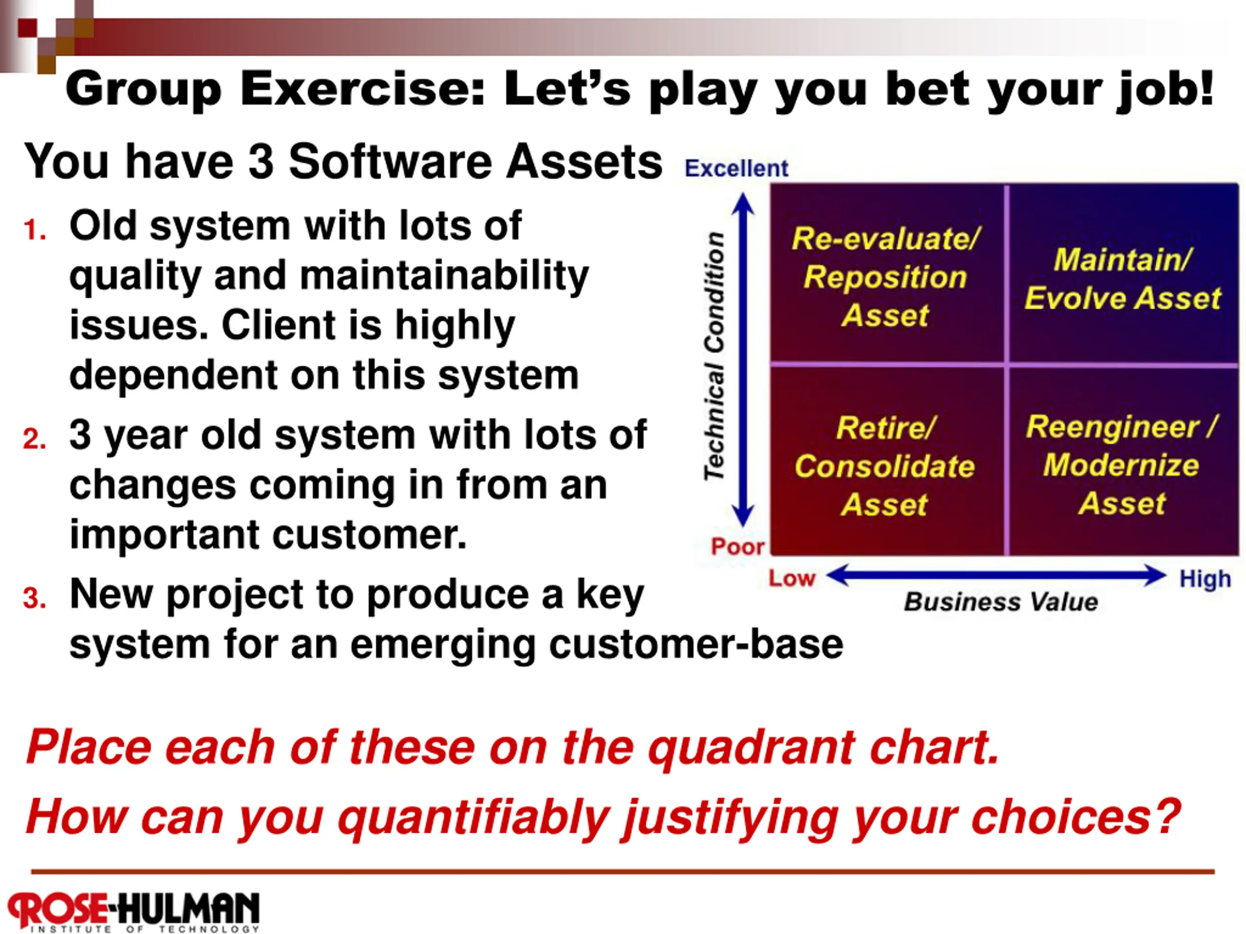 Group Exercise: Lets play you bet your job! You have 3 Software Assets 1. Old system with lots of quality and maintainability issues. Client is highly dependent on this system 2. 3 year old system with lots of changes coming in from an important customer. 3. New project to produce a key system for an emerging customer-base Place each of these on the quadrant chart. How can you quantifiably justifying your choices?