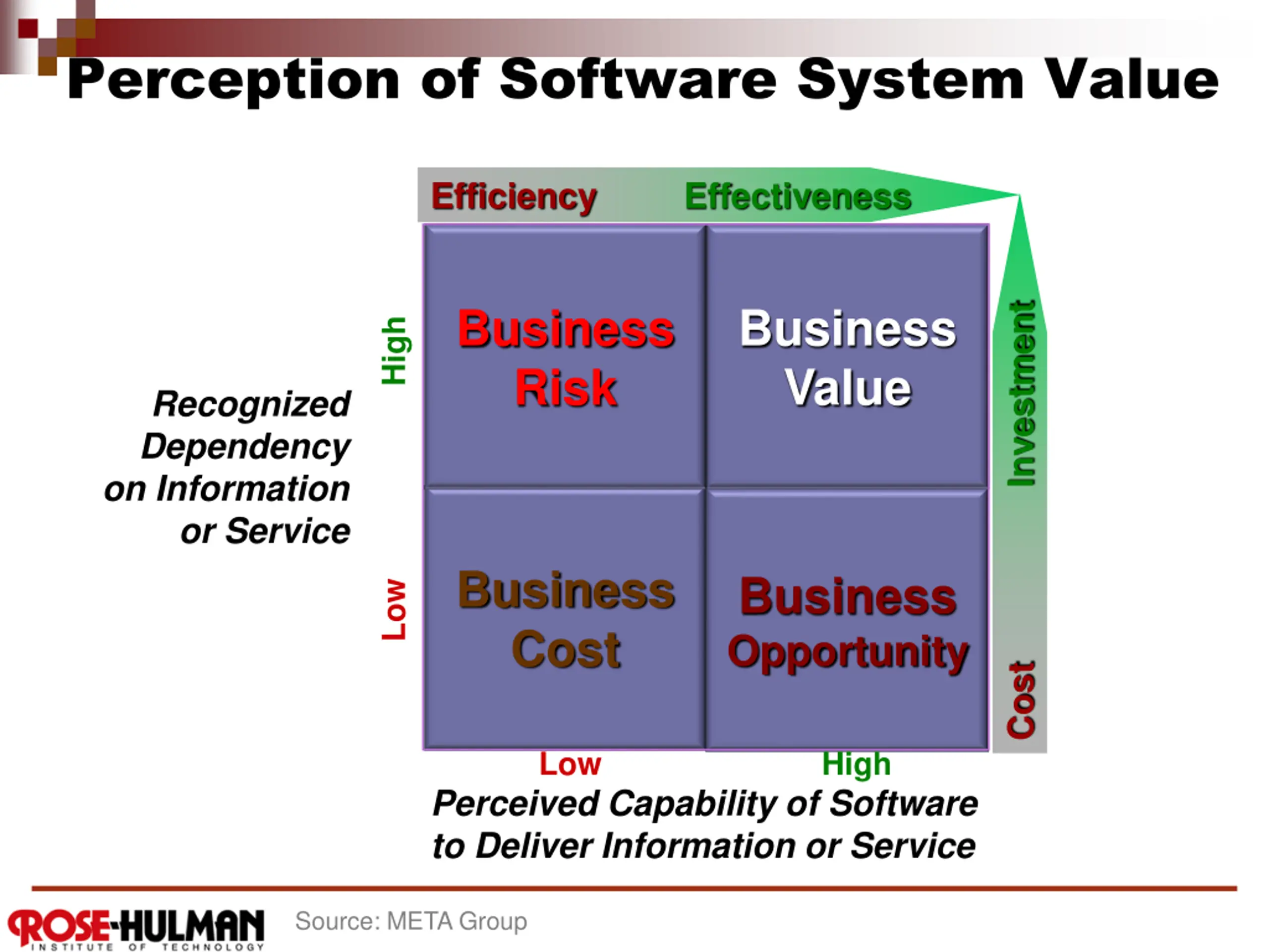 Perception of Software System Value Efficiency Effectiveness Business Risk Business Value Cost Investment High Recognized Dependency on Information or Service Business Cost Business Opportunity Low Low High Perceived Capability of Software to Deliver Information or Service Source: META Group