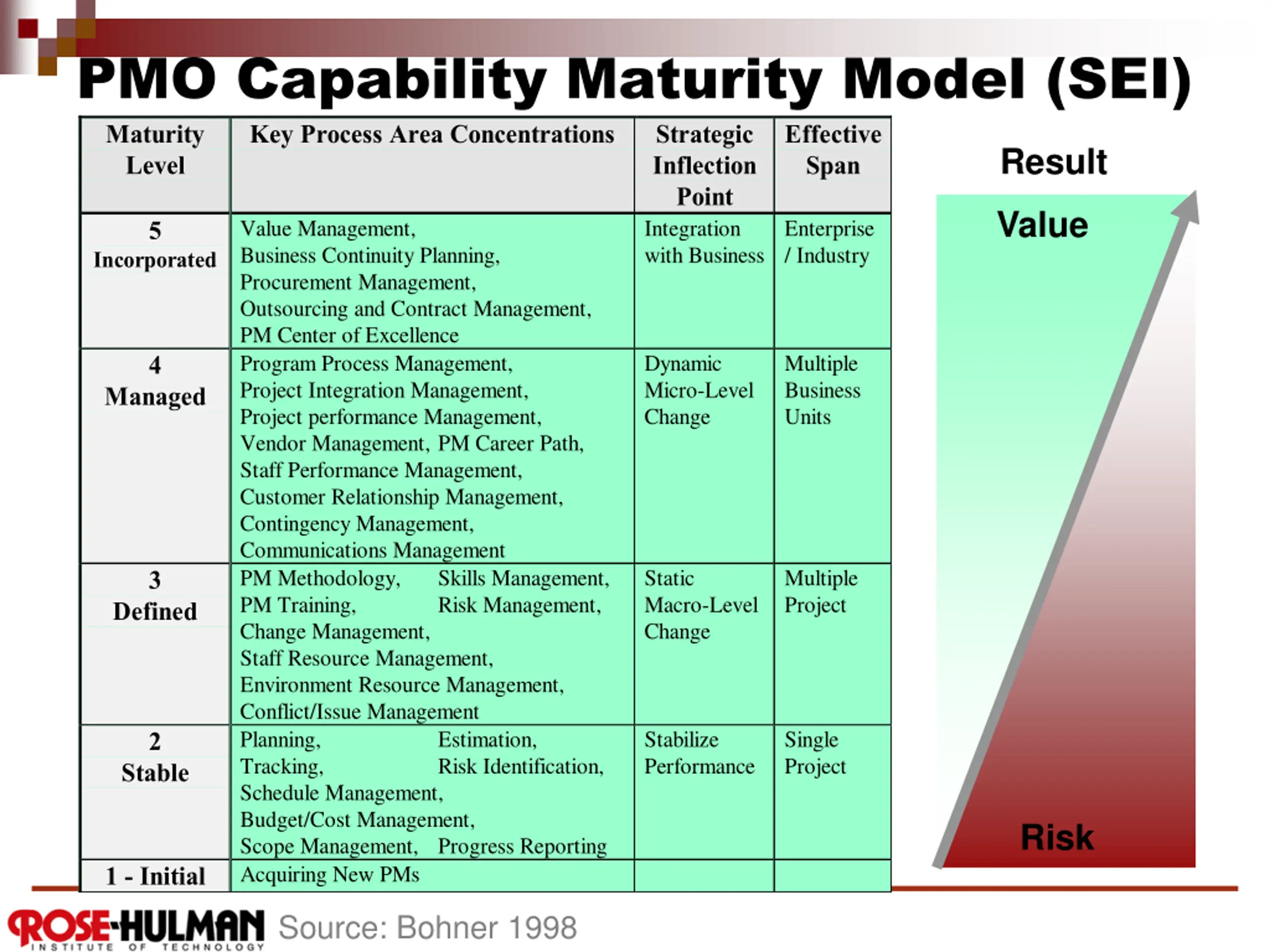 PMO Capability Maturity Model (SEI) Maturity Level Key Process Area Concentrations Strategic Inflection Point Integration with Business Effective Span Result Value Value Management, Business Continuity Planning, Procurement Management, Outsourcing and Contract Management, PM Center of Excellence Program Process Management, Project Integration Management, Project performance Management, Vendor Management, PM Career Path, Staff Performance Management, Customer Relationship Management, Contingency Management, Communications Management PM Methodology, PM Training, Change Management, Staff Resource Management, Environment Resource Management, Conflict/Issue Management Planning, Tracking, Schedule Management, Budget/Cost Management, Scope Management, Progress Reporting Acquiring New PMs Enterprise / Industry 5 Incorporated Dynamic Micro-Level Change Multiple Business Units 4 Managed Skills Management, Risk Management, Static Macro-Level Change Multiple Project 3 Defined Estimation, Risk Identification, Stabilize Performance Single Project 2 Stable Risk 1 - Initial Source: Bohner 1998