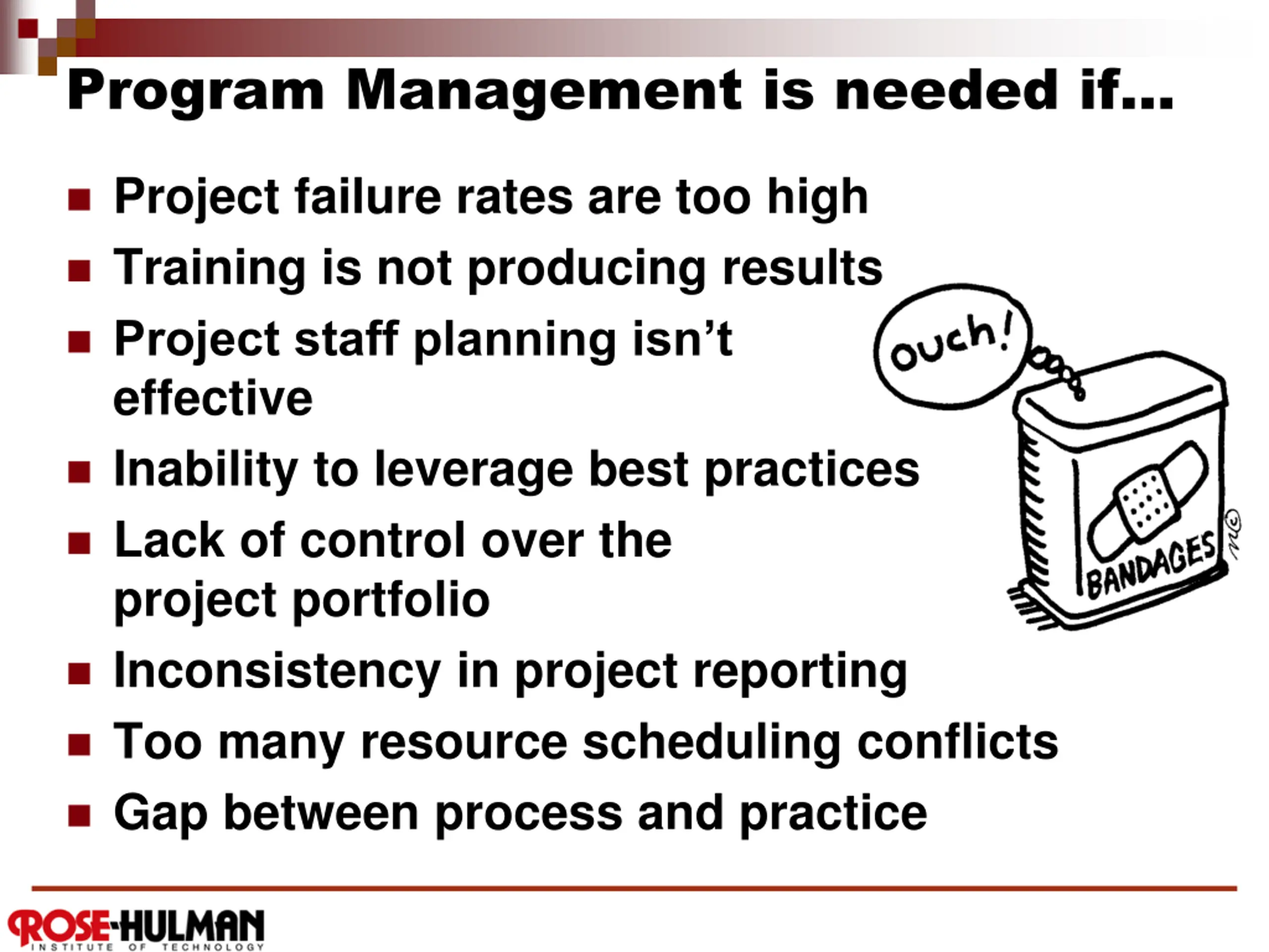 Program Management is needed if Project failure rates are too high Training is not producing results Project staff planning isn t effective Inability to leverage best practices Lack of control over the project portfolio Inconsistency in project reporting Too many resource scheduling conflicts Gap between process and practice