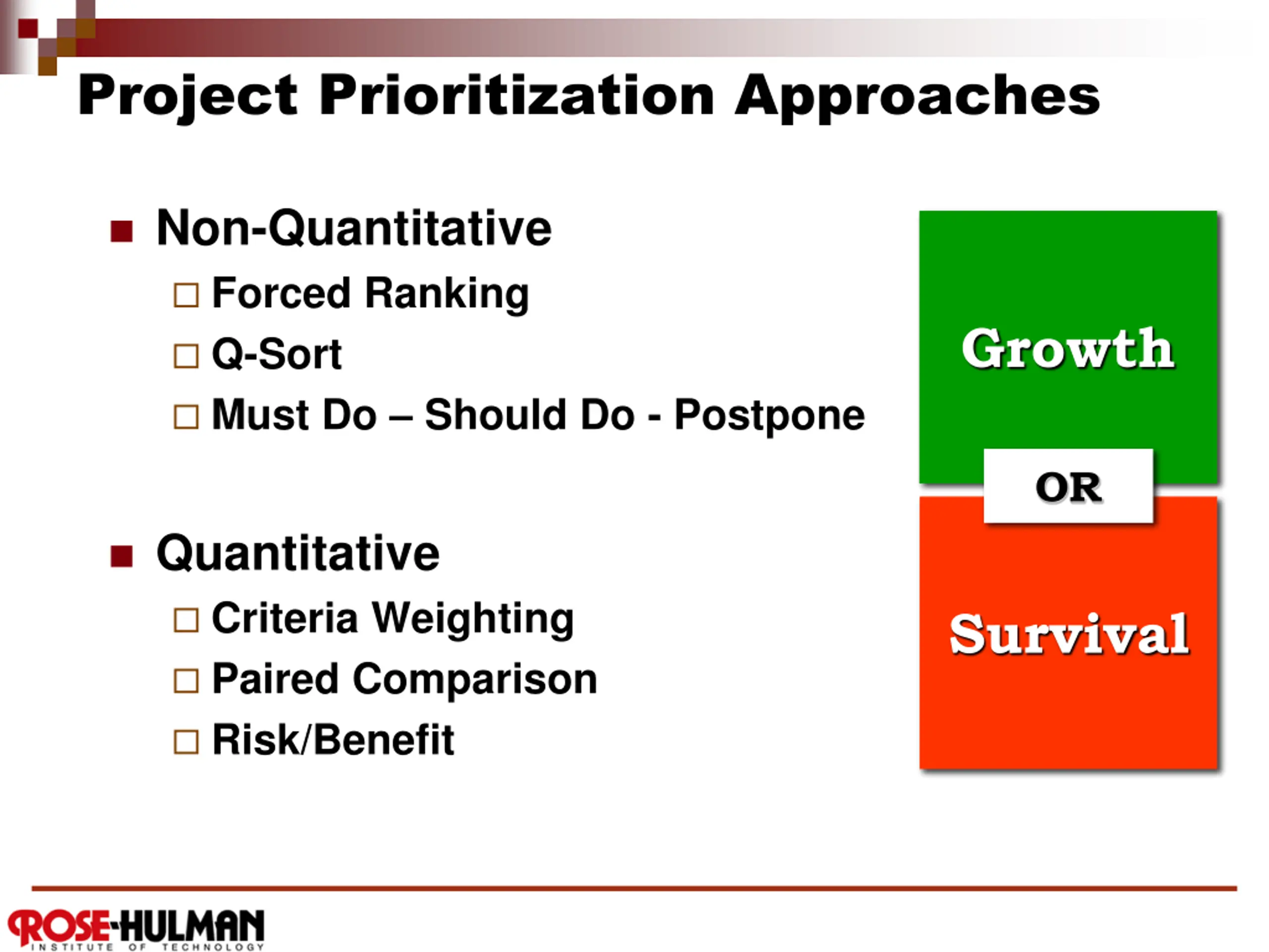Project Prioritization Approaches Non-Quantitative Forced Ranking Q-Sort Must Do Should Do - Postpone Growth OR Quantitative Criteria Weighting Paired Comparison Risk/Benefit Survival