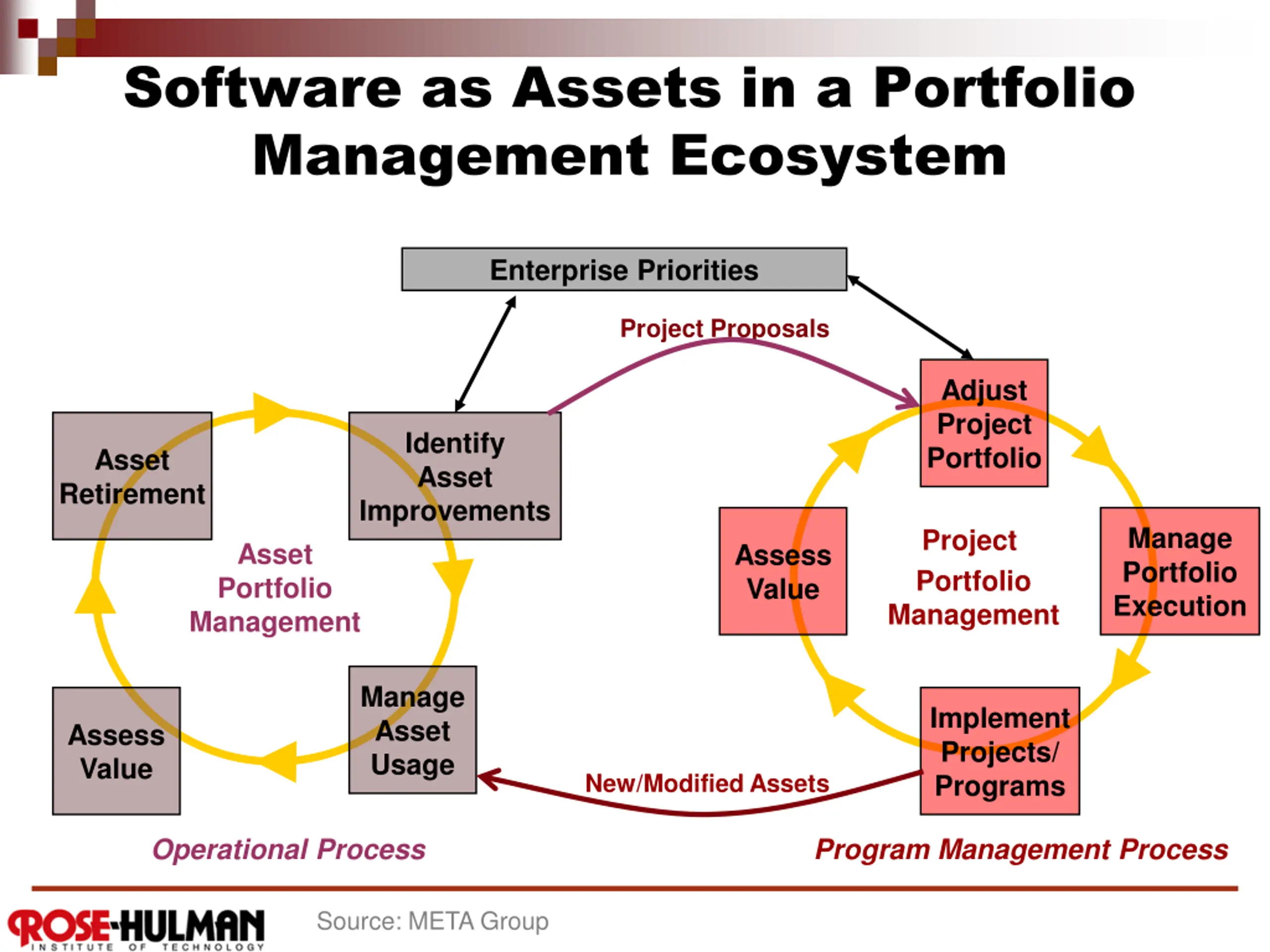 Software as Assets in a Portfolio Management Ecosystem Enterprise Priorities Project Proposals Adjust Project Portfolio Identify Asset Improvements Asset Retirement Manage Portfolio Execution Project Portfolio Management Asset Portfolio Management Assess Value Manage Asset Usage Implement Projects/ Programs Assess Value New/Modified Assets Operational Process Program Management Process Source: META Group