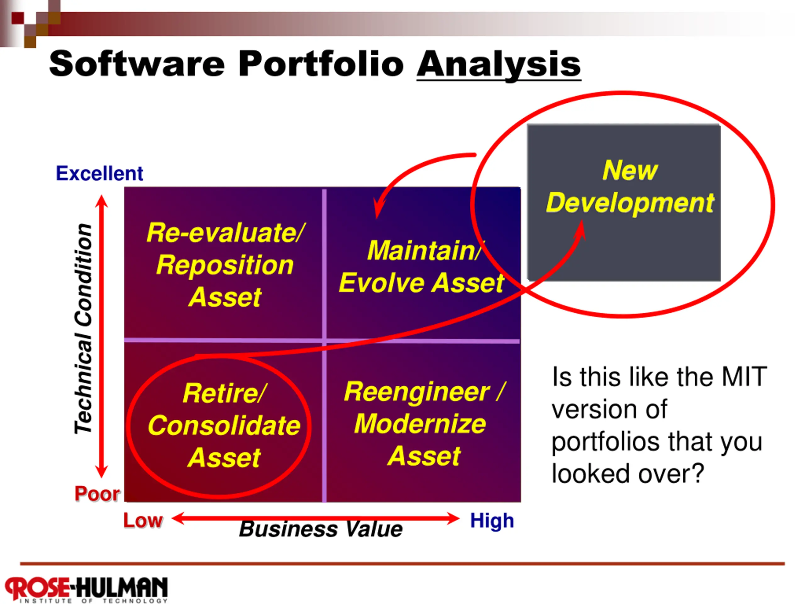 Software Portfolio Analysis New Excellent Development Re-evaluate/ Reposition Asset Technical Condition Maintain/ Evolve Asset Is this like the MIT version of portfolios that you looked over? Reengineer / Modernize Asset Retire/ Consolidate Asset Poor Low High Business Value