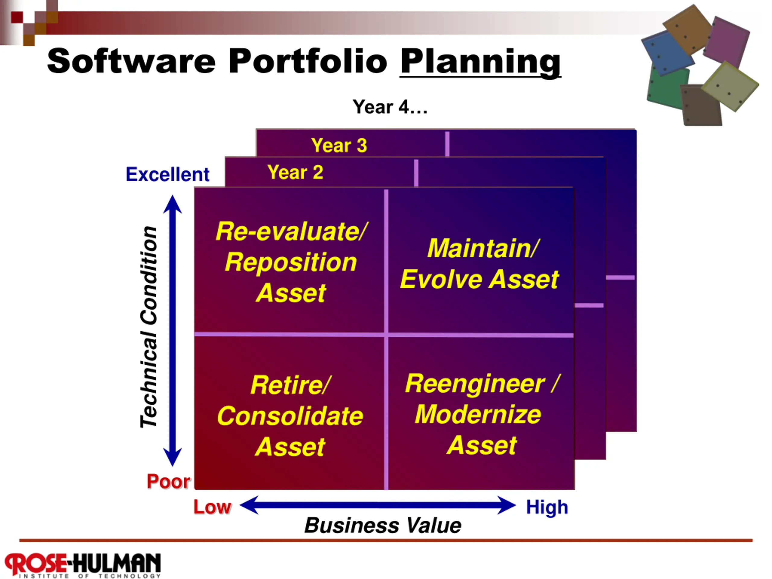 Software Portfolio Planning Year 4 Year 3 Year 2 Excellent Re-evaluate/ Reposition Asset Technical Condition Maintain/ Evolve Asset Reengineer / Modernize Asset Retire/ Consolidate Asset Poor Low High Business Value