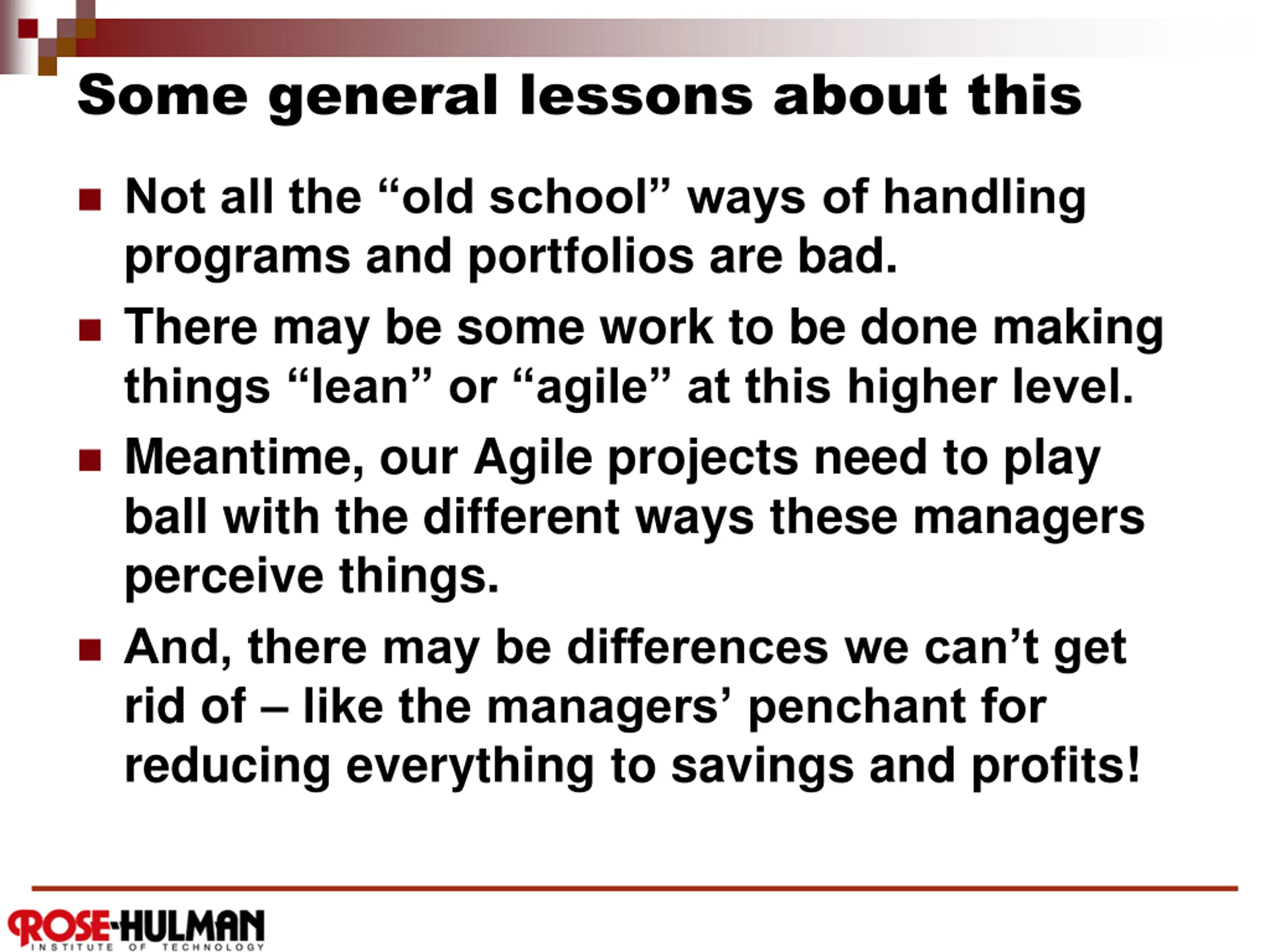Some general lessons about this Not all the old school ways of handling programs and portfolios are bad. There may be some work to be done making things lean or agile at this higher level. Meantime, our Agile projects need to play ball with the different ways these managers perceive things. And, there may be differences we can t get rid of like the managers penchant for reducing everything to savings and profits!