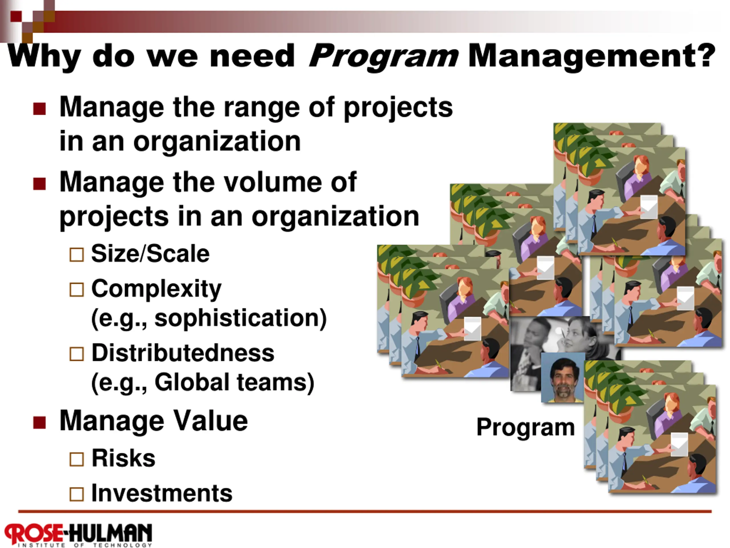 Why do we need Program Management? Manage the range of projects in an organization Manage the volume of projects in an organization Size/Scale Complexity (e.g., sophistication) Distributedness (e.g., Global teams) Manage Value Risks Investments Small Project Person Project Large Project Program