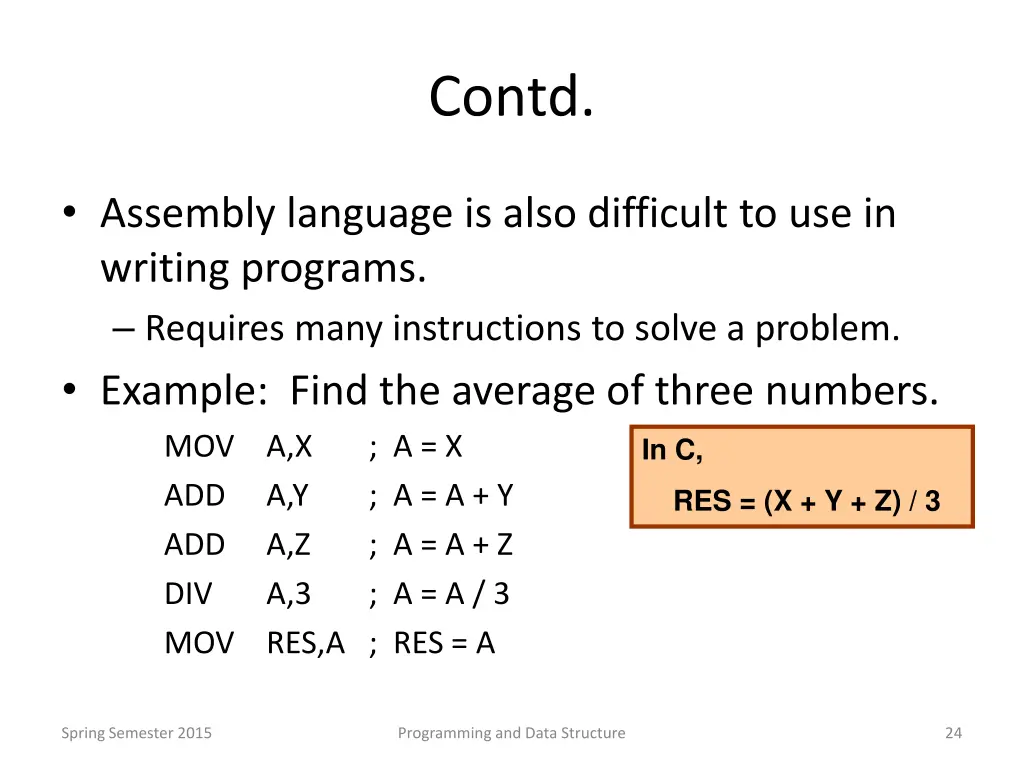 Contd. Assembly language is also difficult to use in writing programs. Requires many instructions to solve a problem. Example: Find the average of three numbers. MOV A,X ; A = X ADD A,Y ; A = A + Y ADD A,Z ; A = A + Z DIV A,3 ; A = A / 3 MOV RES,A ; RES = A In C, RES = (X + Y + Z) / 3 Spring Semester 2015 Programming and Data Structure 24