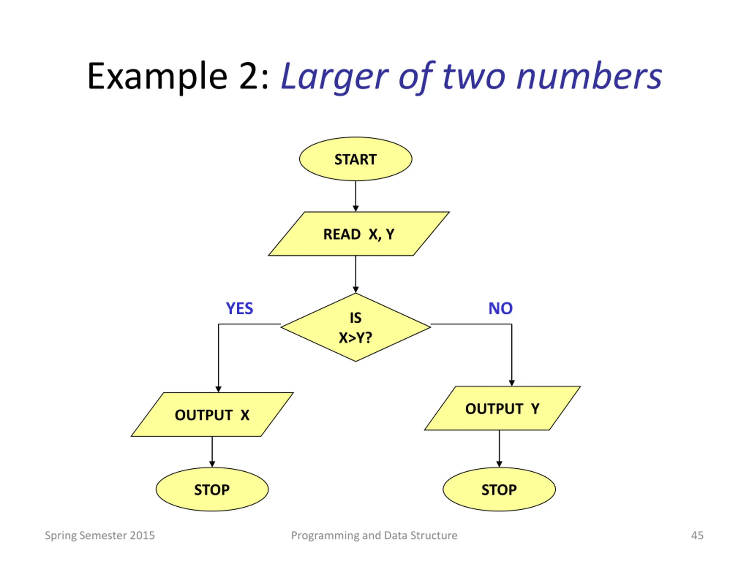 Example 2: Larger of two numbers START READ X, Y YES NO IS X>Y? OUTPUT Y OUTPUT X STOP STOP Spring Semester 2015 Programming and Data Structure 45