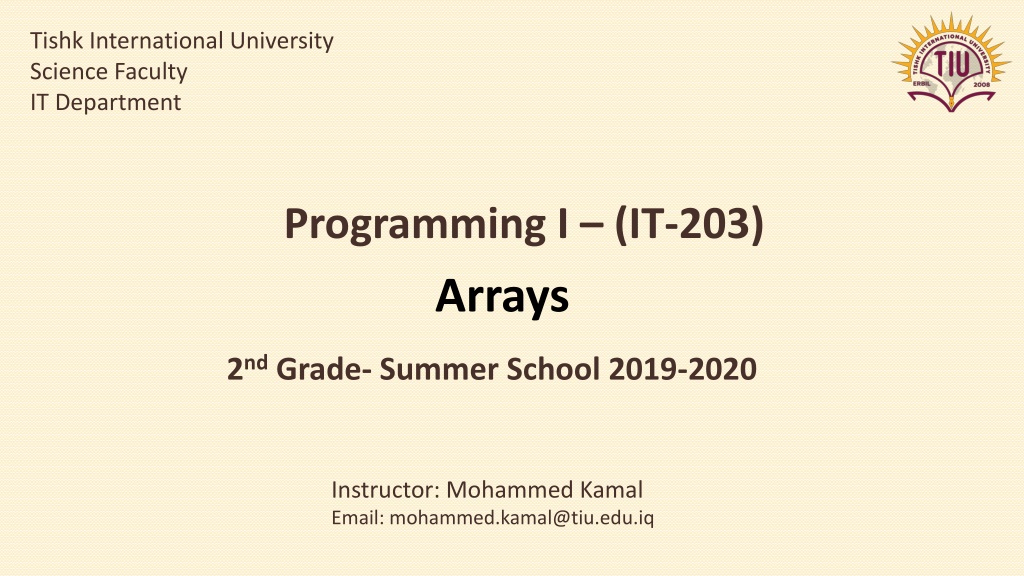 Tishk International University Science Faculty IT Department Programming I (IT-203) Arrays 2nd Grade- Summer School 2019-2020 Instructor: Mohammed Kamal Email: mohammed.kamal@tiu.edu.iq