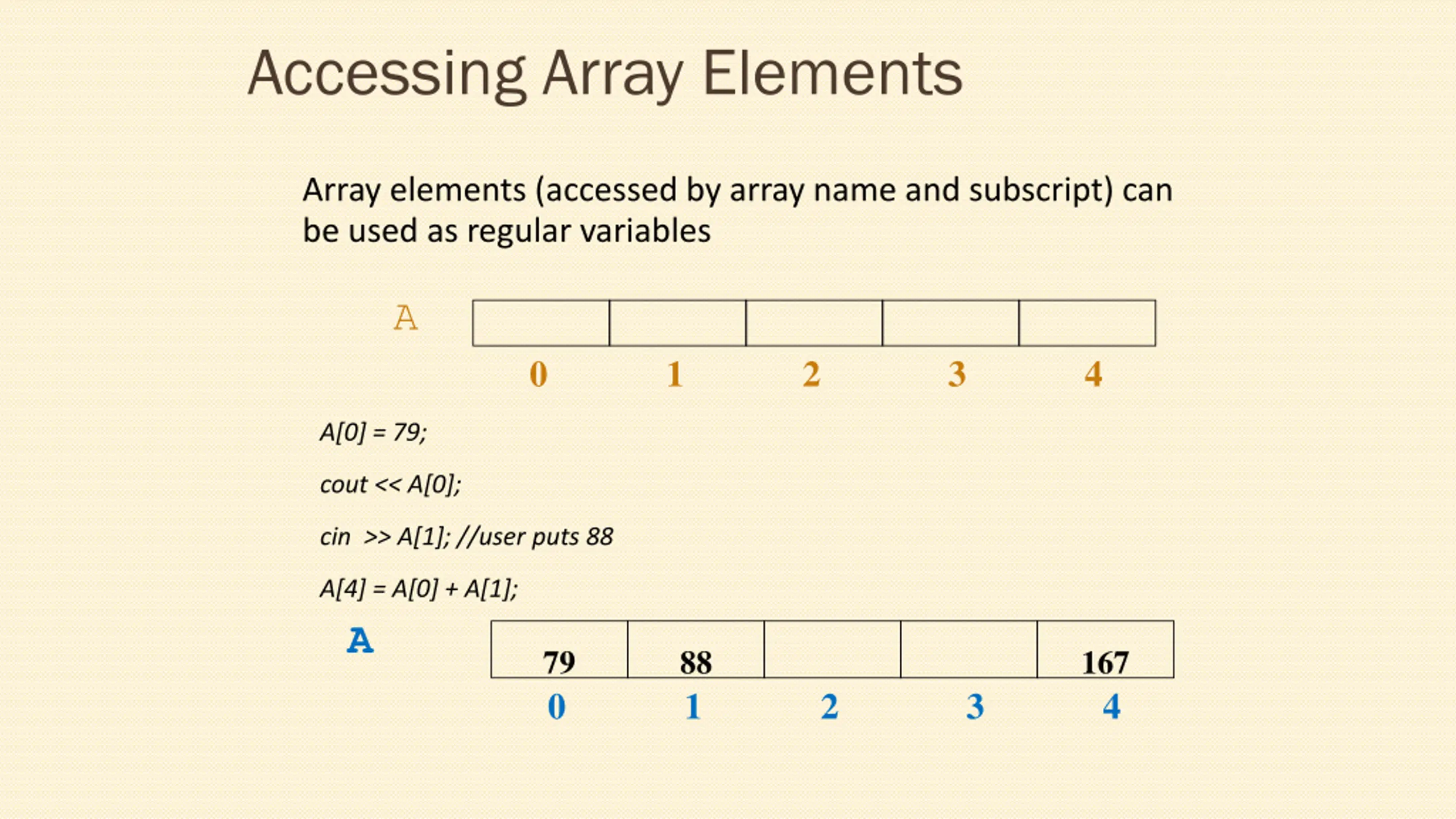 Accessing Array Elements Array elements (accessed by array name and subscript) can be used as regular variables A 0 1 2 3 4 A[0] = 79; cout << A[0]; cin >> A[1]; //user puts 88 A[4] = A[0] + A[1]; A 79 88 167 0 1 2 3 4