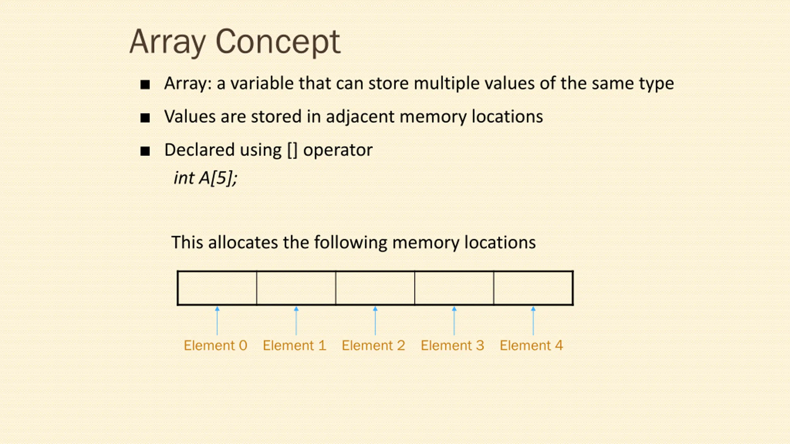 Array Concept Array: a variable that can store multiple values of the same type Values are stored in adjacent memory locations Declared using [] operator int A[5]; This allocates the following memory locations Element 0 Element 1 Element 2 Element 3 Element 4
