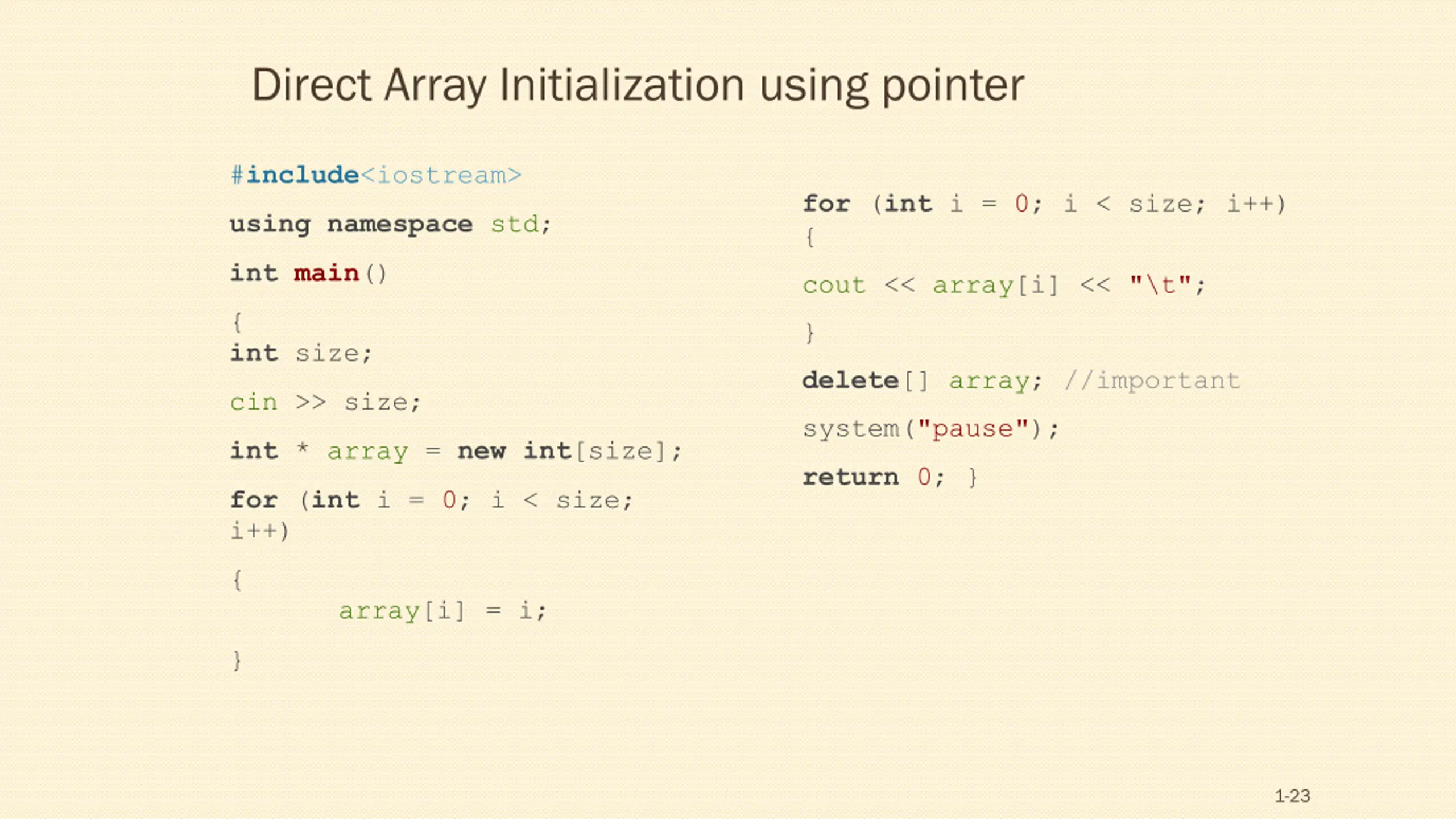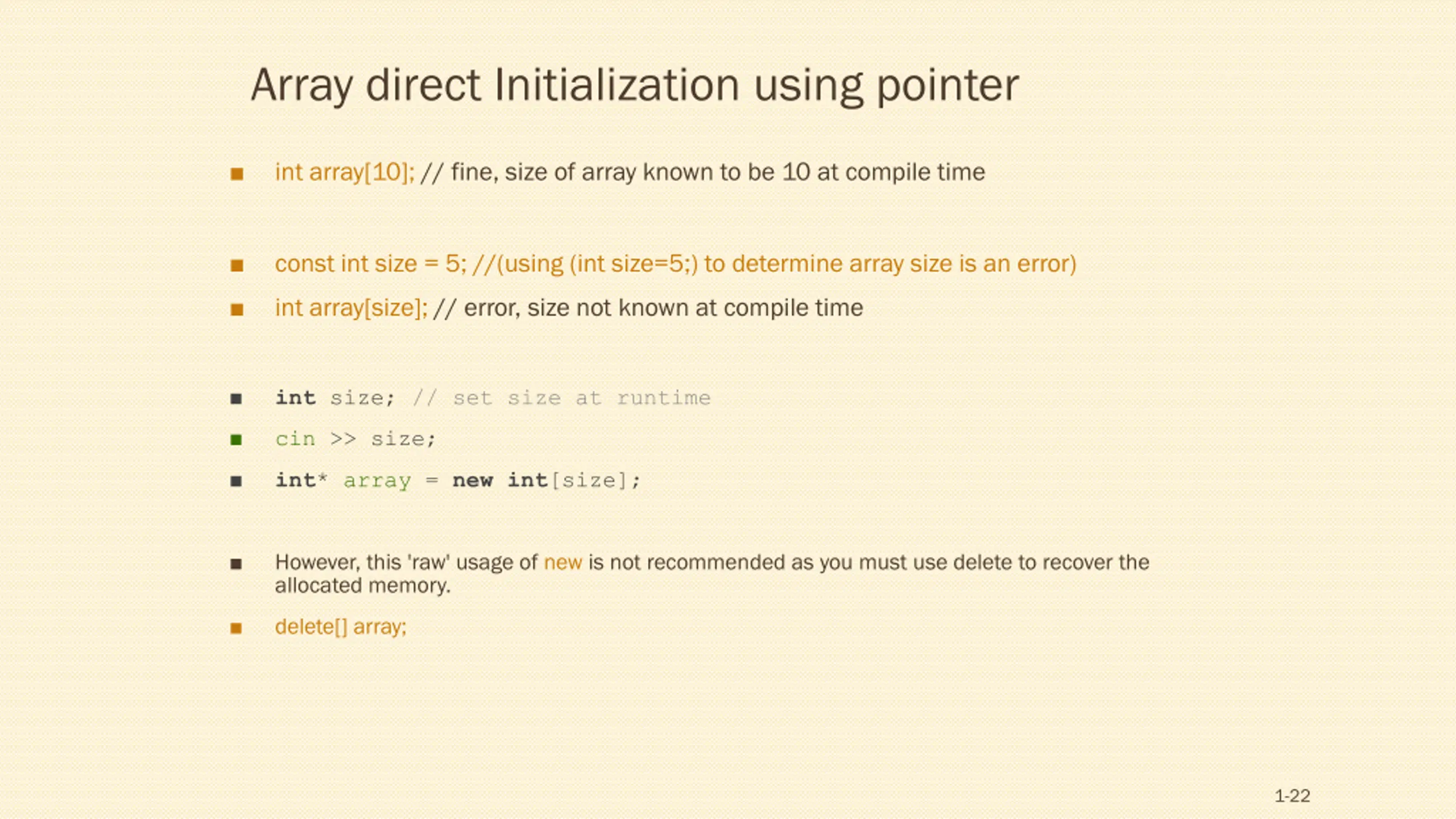Array direct Initialization using pointer int array[10]; // fine, size of array known to be 10 at compile time const int size = 5; //(using (int size=5;) to determine array size is an error) int array[size]; // error, size not known at compile time int size; // set size at runtime cin >> size; int* array = newint[size]; However, this 'raw' usage of new is not recommended as you must use delete to recover the allocated memory. delete[] array; 1-22