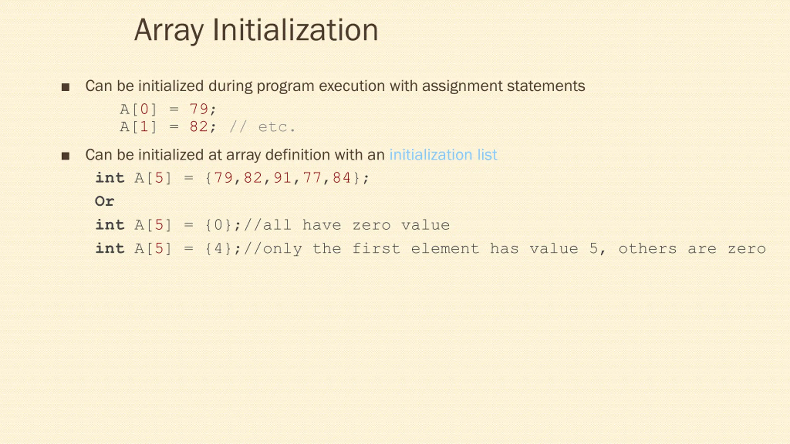 Array Initialization Can be initialized during program execution with assignment statements A[0] = 79; A[1] = 82; // etc. Can be initialized at array definition with an initialization list int A[5] = {79,82,91,77,84}; Or int A[5] = {0};//all have zero value int A[5] = {4};//only the first element has value 5, others are zero