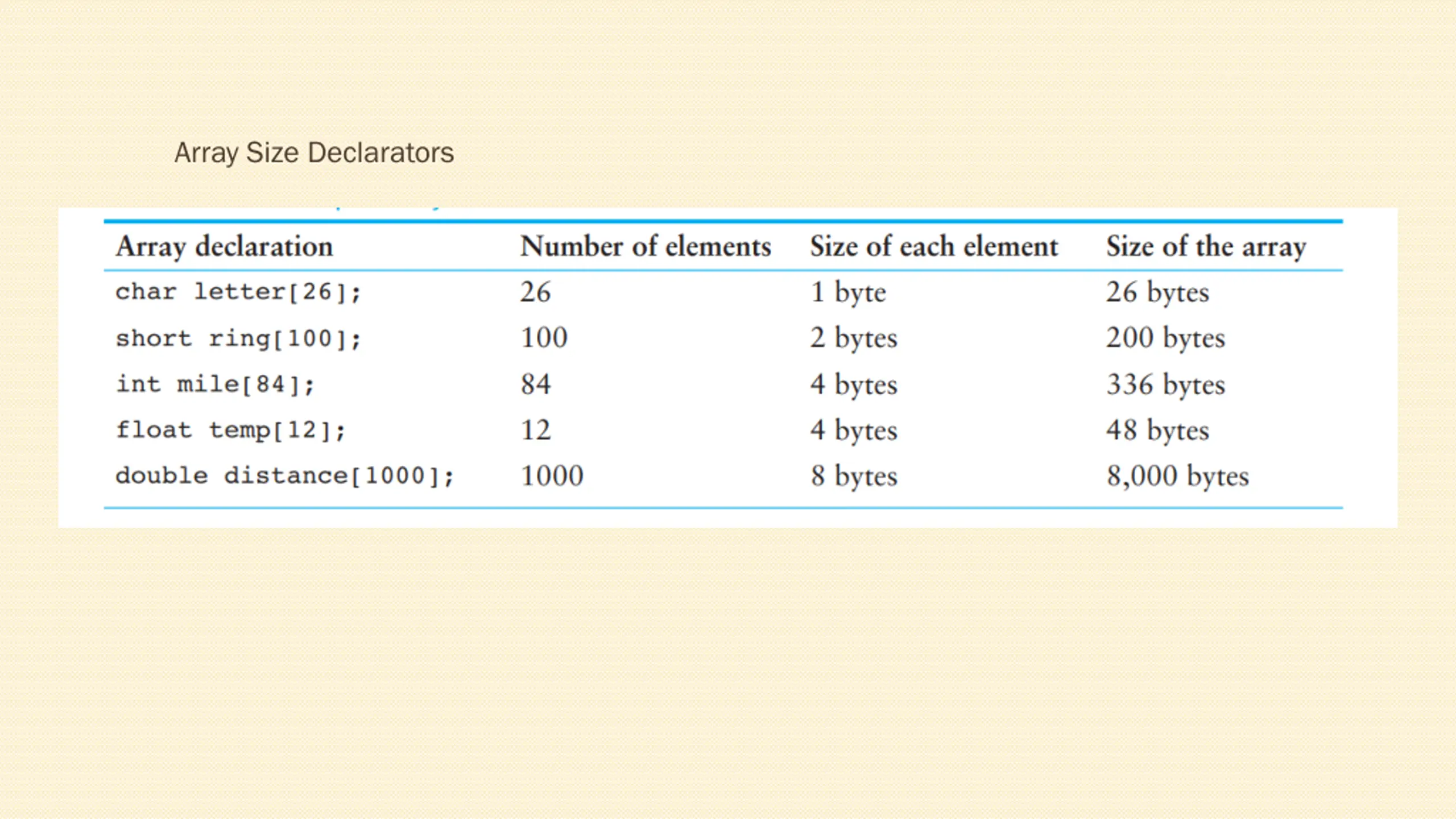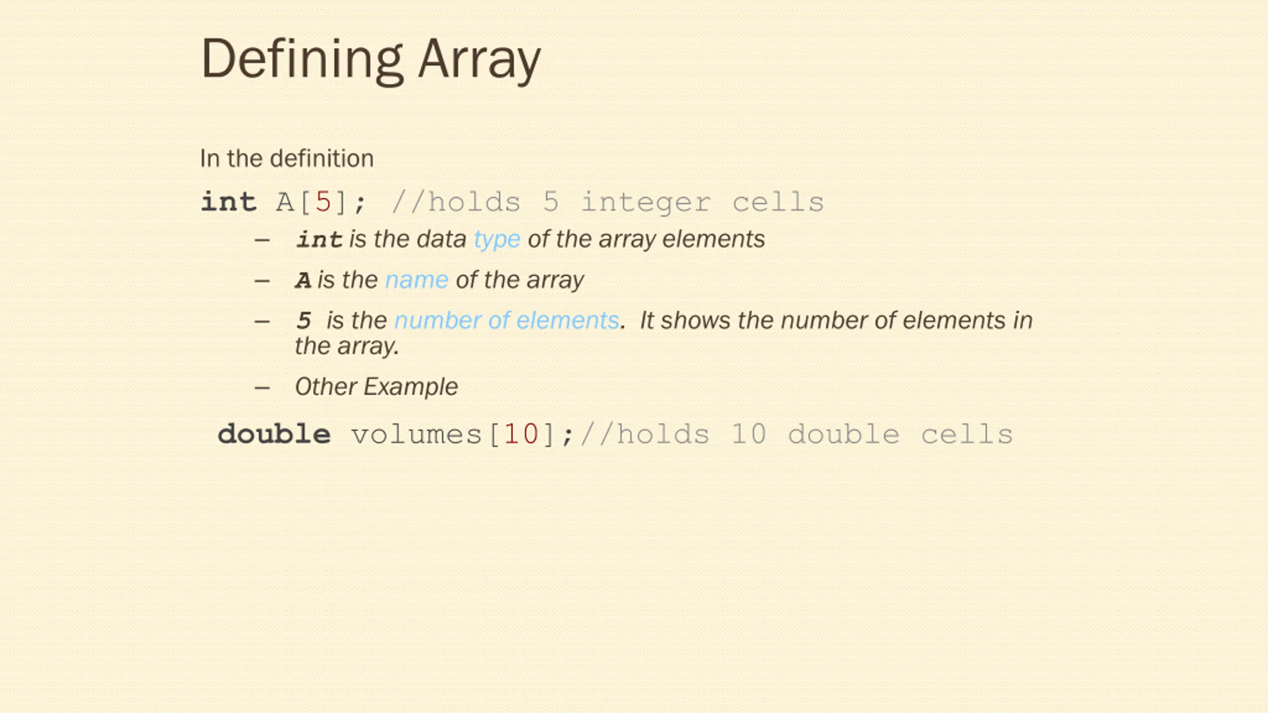 Defining Array In the definition int A[5]; //holds 5 integer cells int is the data type of the array elements A is the name of the array 5 is the number of elements. It shows the number of elements in the array. Other Example double volumes[10];//holds 10 double cells