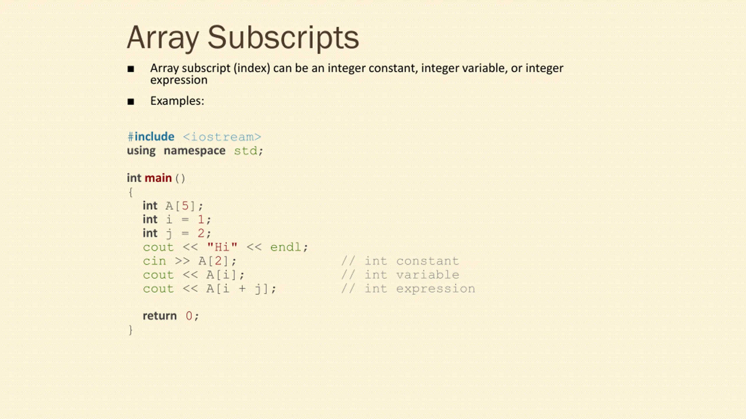 Array Subscripts Array subscript (index) can be an integer constant, integer variable, or integer expression Examples: #include <iostream> usingnamespace std; int main() { int A[5]; int i = 1; int j = 2; cout << "Hi" << endl; cin >> A[2]; cout << A[i]; cout << A[i + j]; // int constant // int variable // int expression return 0; }