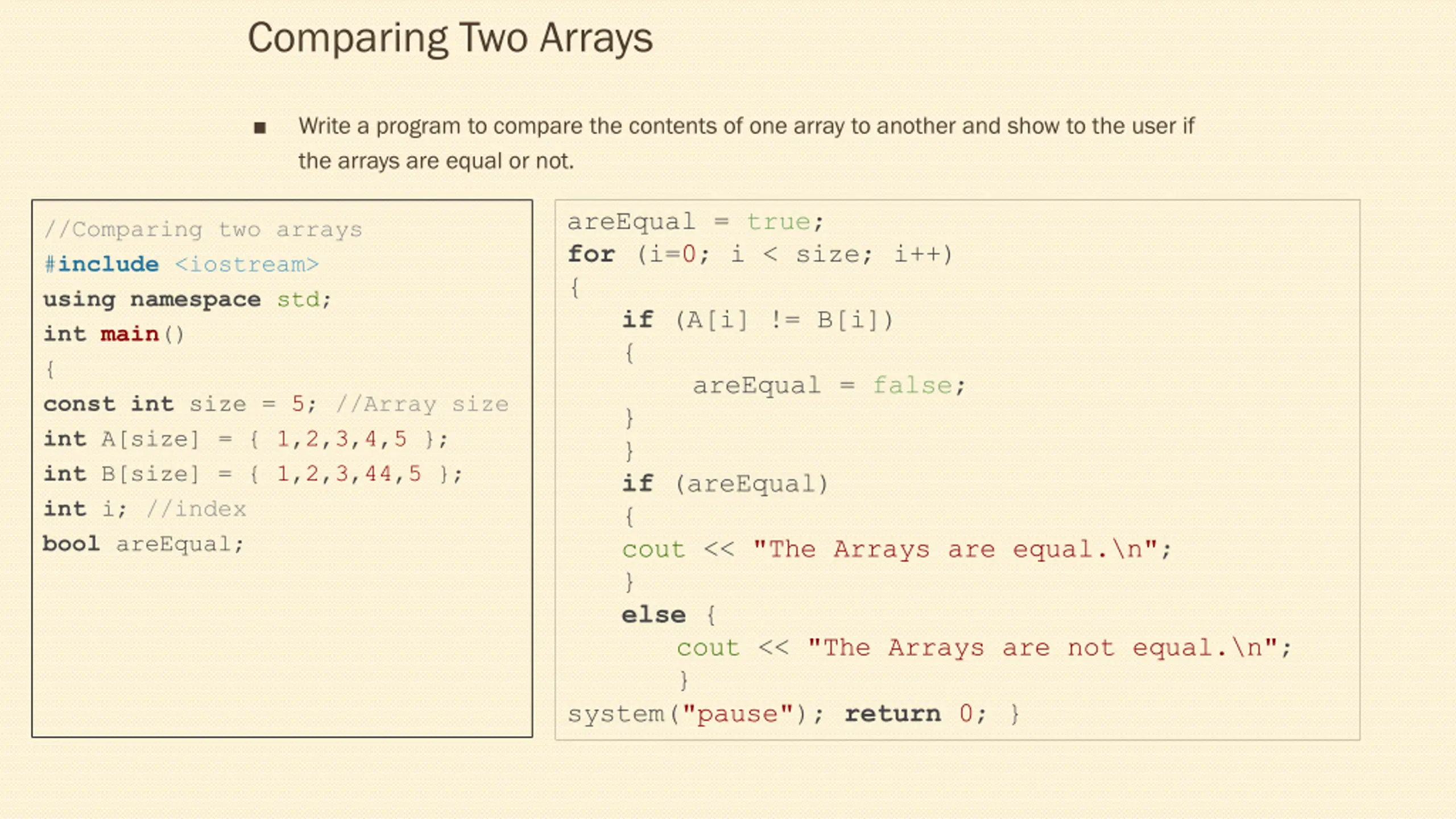Comparing Two Arrays Write a program to compare the contents of one array to another and show to the user if the arrays are equal or not. areEqual = true; for (i=0; i < size; i++) { if (A[i] != B[i]) { areEqual = false; } } if (areEqual) { cout << "The Arrays are equal.\n"; } else { cout << "The Arrays are not equal.\n"; } system("pause"); return 0; } //Comparing two arrays #include <iostream> usingnamespace std; intmain() { constint size = 5; //Array size int A[size] = { 1,2,3,4,5 }; int B[size] = { 1,2,3,44,5 }; int i; //index bool areEqual;
