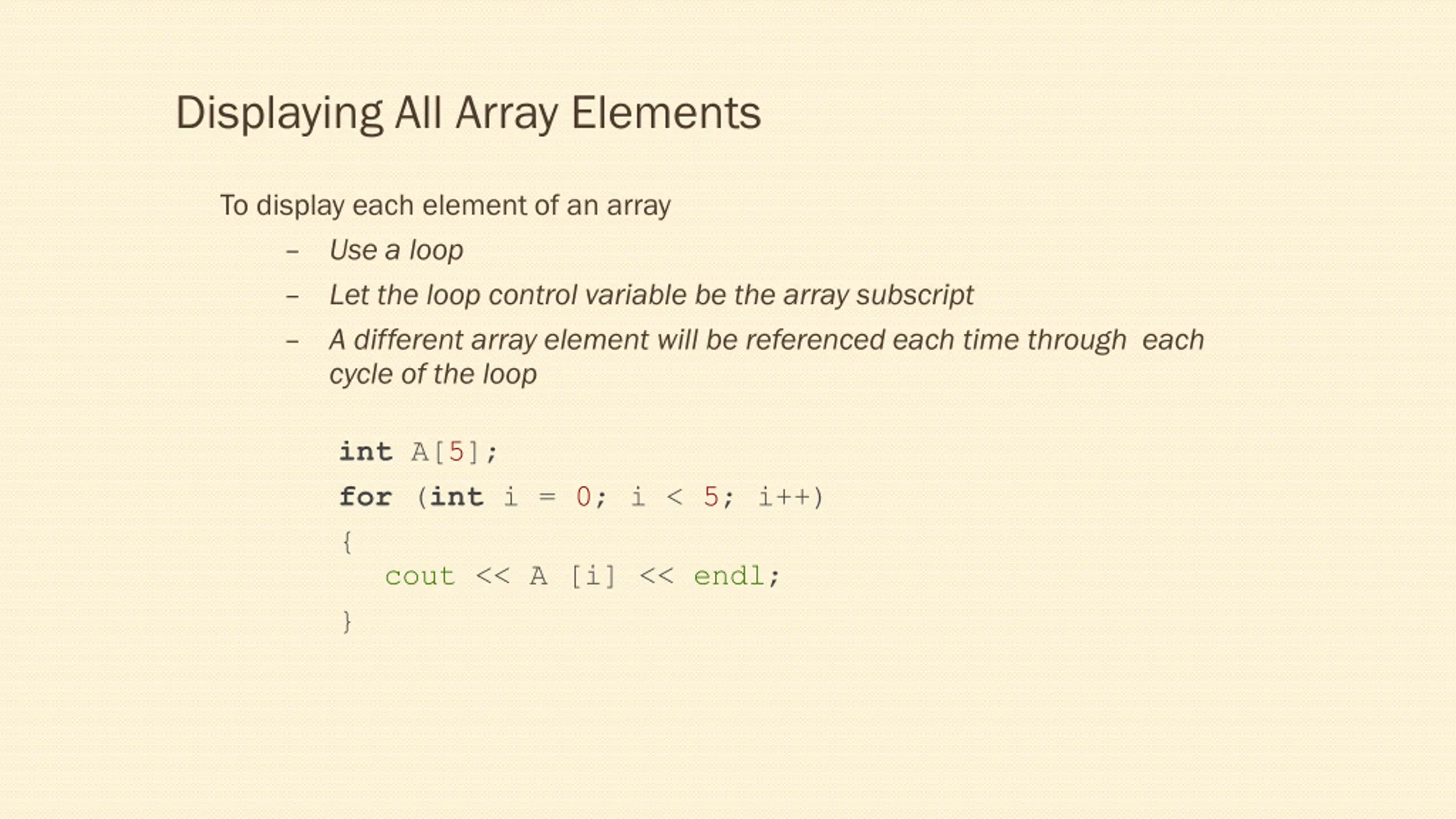 Displaying All Array Elements To display each element of an array Use a loop Let the loop control variable be the array subscript A different array element will be referenced each time through each cycle of the loop int A[5]; for (int i = 0; i < 5; i++) { cout << A [i] << endl; }