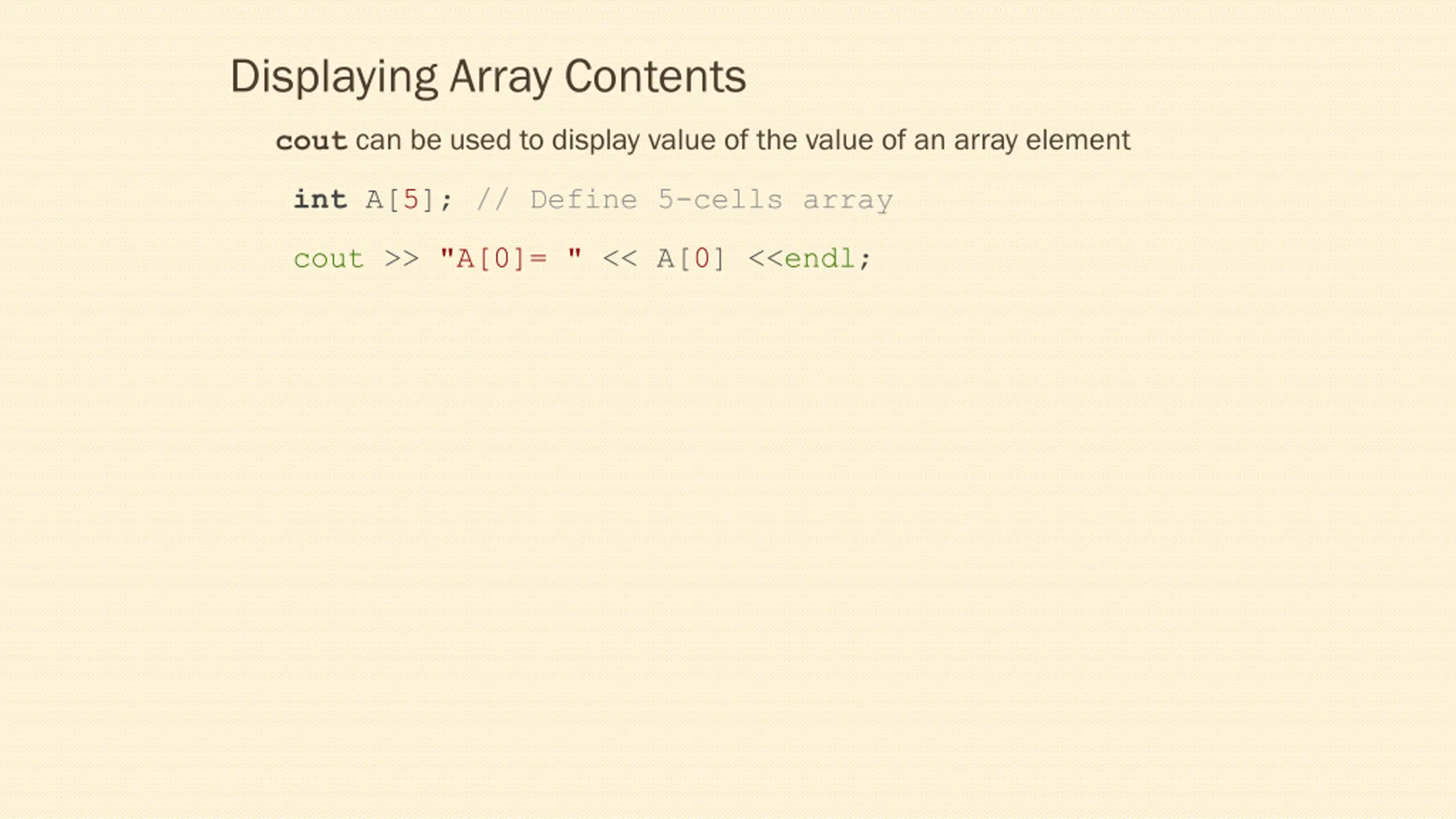 Displaying Array Contents cout can be used to display value of the value of an array element int A[5]; // Define 5-cells array cout >> "A[0]= " << A[0] <<endl;
