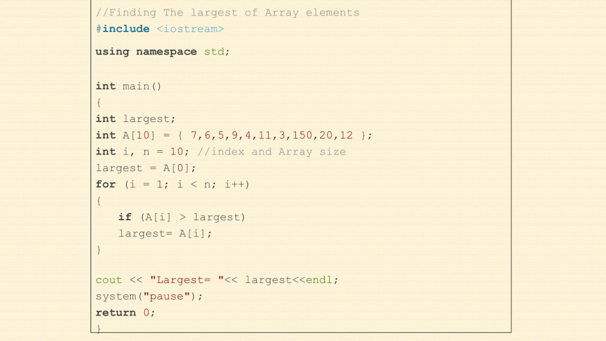 //Finding The largest of Array elements #include <iostream> usingnamespace std; int main() { int largest; int A[10] = { 7,6,5,9,4,11,3,150,20,12 }; int i, n = 10; //index and Array size largest = A[0]; for (i = 1; i < n; i++) { if (A[i] > largest) largest= A[i]; } cout << "Largest= "<< largest<<endl; system("pause"); return 0; }