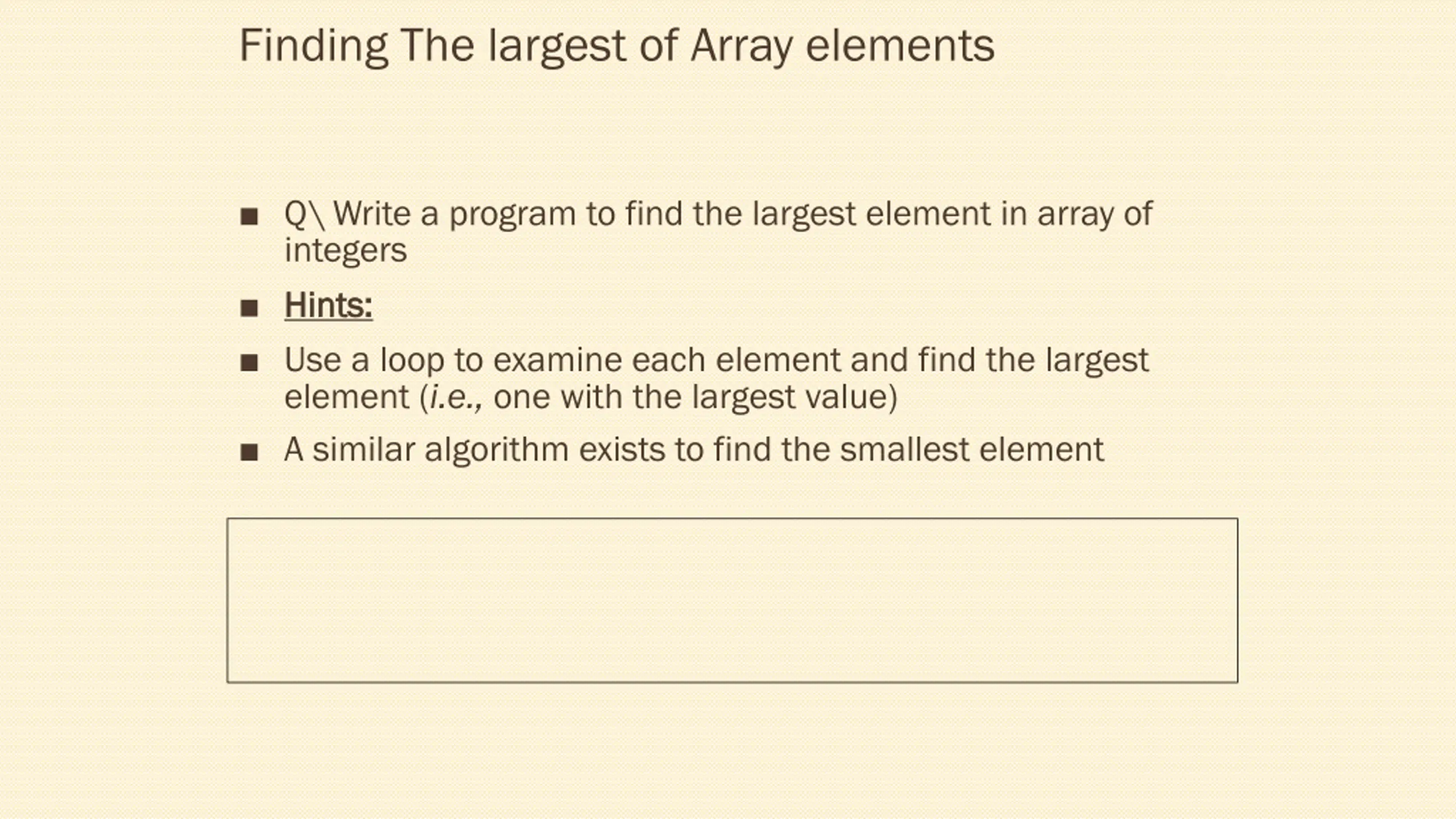 Finding The largest of Array elements Q\ Write a program to find the largest element in array of integers Hints: Hints: Use a loop to examine each element and find the largest element (i.e., one with the largest value) A similar algorithm exists to find the smallest element