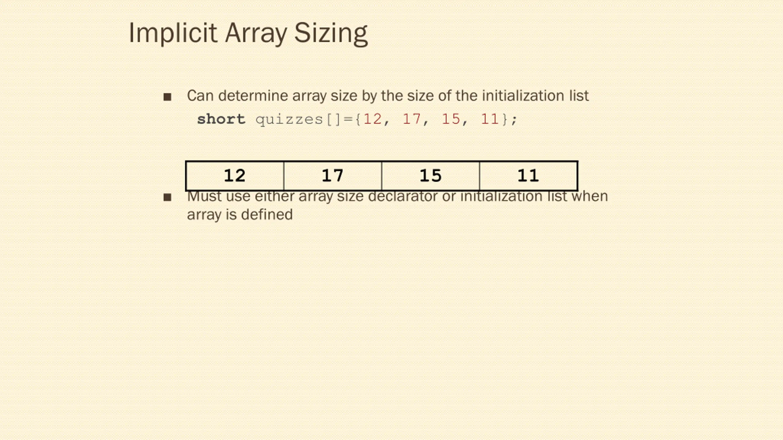 Implicit Array Sizing Can determine array size by the size of the initialization list short quizzes[]={12, 17, 15, 11}; 12 17 15 11 Must use either array size declarator or initialization list when array is defined