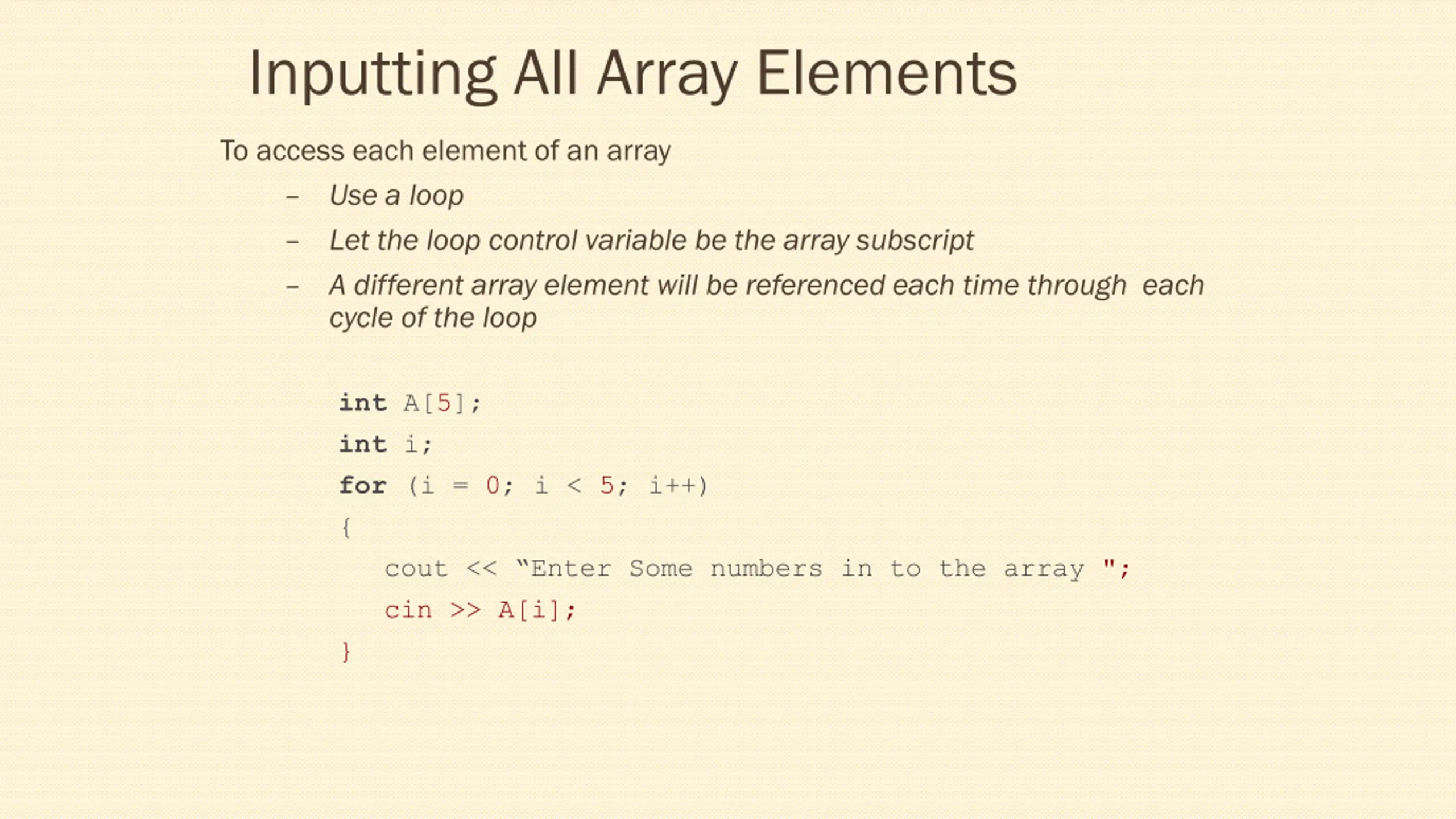 Inputting All Array Elements To access each element of an array Use a loop Let the loop control variable be the array subscript A different array element will be referenced each time through each cycle of the loop int A[5]; int i; for (i = 0; i < 5; i++) { cout << Enter Some numbers in to the array "; cin >> A[i]; }