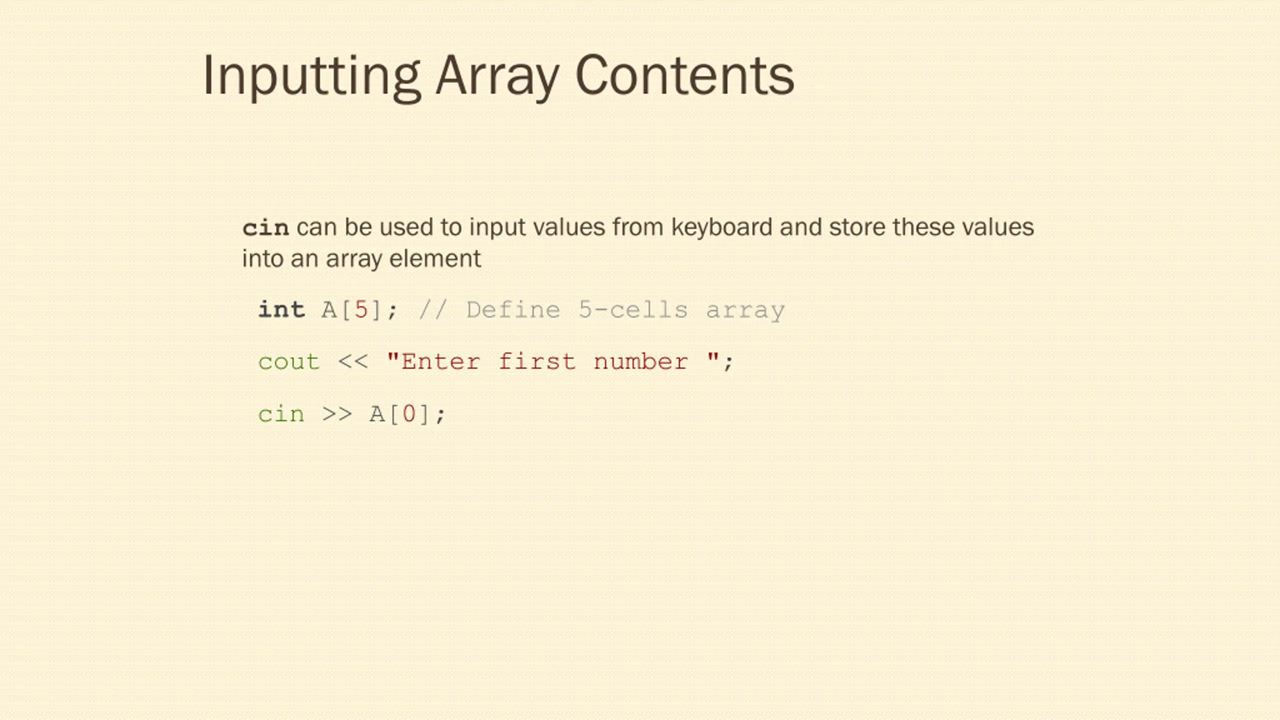 Inputting Array Contents cin can be used to input values from keyboard and store these values into an array element int A[5]; // Define 5-cells array cout << "Enter first number "; cin >> A[0];