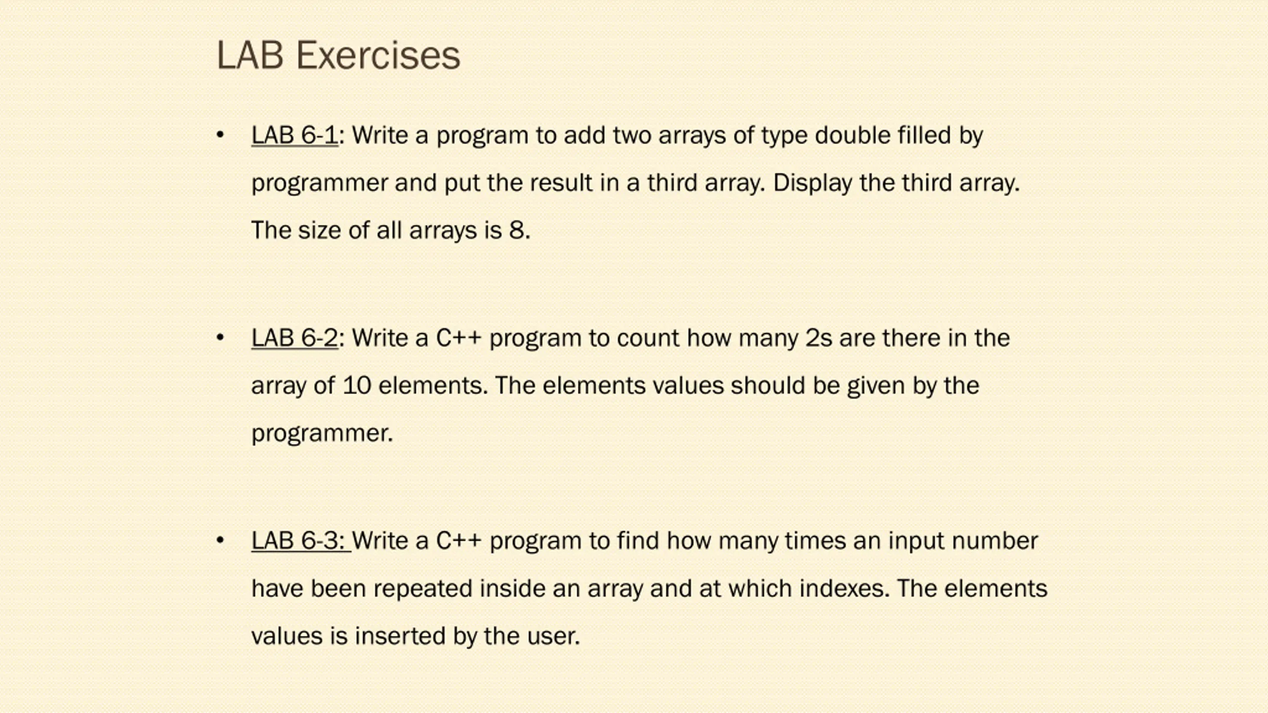 LAB Exercises LAB 6-1: Write a program to add two arrays of type double filled by programmer and put the result in a third array. Display the third array. The size of all arrays is 8. LAB 6-2: Write a C++ program to count how many 2s are there in the array of 10 elements. The elements values should be given by the programmer. LAB 6-3: Write a C++ program to find how many times an input number have been repeated inside an array and at which indexes. The elements values is inserted by the user.