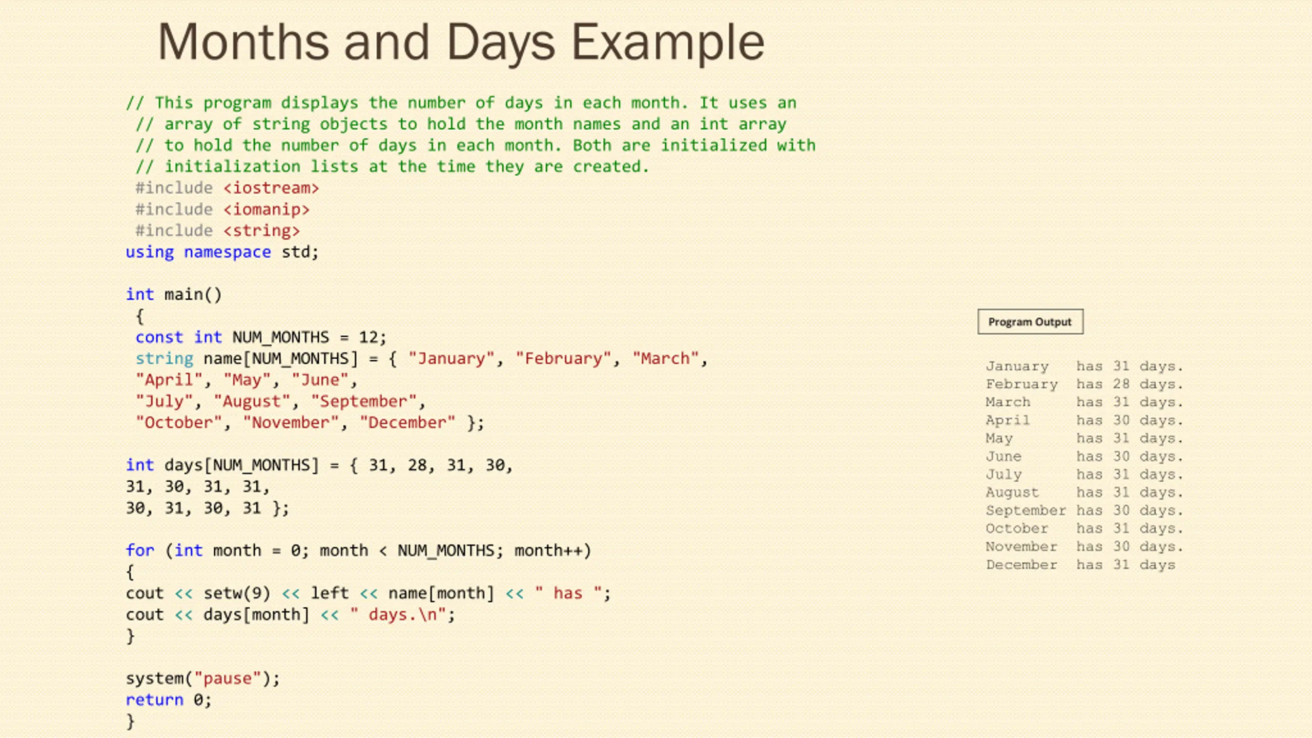 Months and Days Example // This program displays the number of days in each month. It uses an // array of string objects to hold the month names and an int array // to hold the number of days in each month. Both are initialized with // initialization lists at the time they are created. #include <iostream> #include <iomanip> #include <string> using namespace std; int main() { const int NUM_MONTHS = 12; string name[NUM_MONTHS] = { "January", "February", "March", "April", "May", "June", "July", "August", "September", "October", "November", "December" }; Program Output January has 31 days. February has 28 days. March has 31 days. April has 30 days. May has 31 days. June has 30 days. July has 31 days. August has 31 days. September has 30 days. October has 31 days. November has 30 days. December has 31 days int days[NUM_MONTHS] = { 31, 28, 31, 30, 31, 30, 31, 31, 30, 31, 30, 31 }; for (int month = 0; month < NUM_MONTHS; month++) { cout << setw(9) << left << name[month] << " has "; cout << days[month] << " days.\n"; } system("pause"); return 0; }