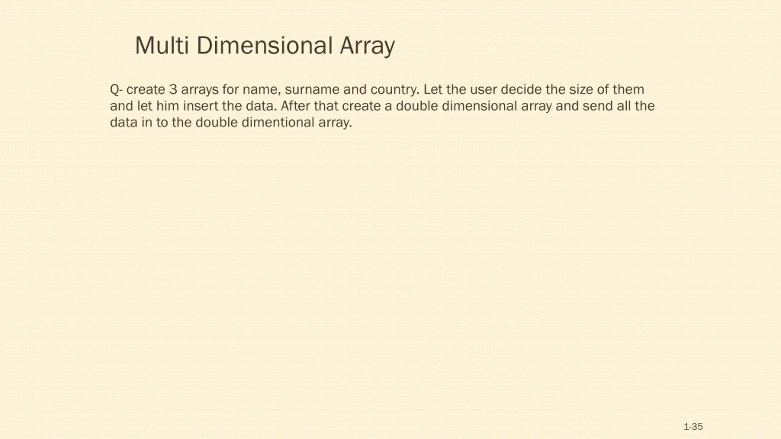 Multi Dimensional Array Q- create 3 arrays for name, surname and country. Let the user decide the size of them and let him insert the data. After that create a double dimensional array and send all the data in to the double dimentional array. 1-35
