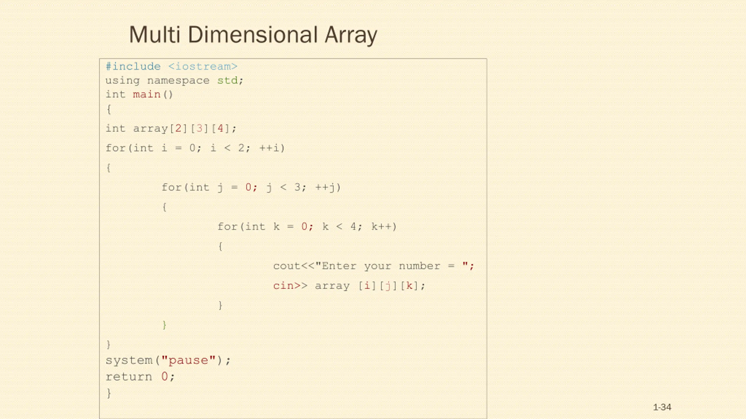 Multi Dimensional Array #include <iostream> using namespace std; int main() { int array[2][3][4]; for(int i = 0; i < 2; ++i) { for(int j = 0; j < 3; ++j) { for(int k = 0; k < 4; k++) { cout<<"Enter your number = "; cin>> array [i][j][k]; } } } system("pause"); return 0; } 1-34