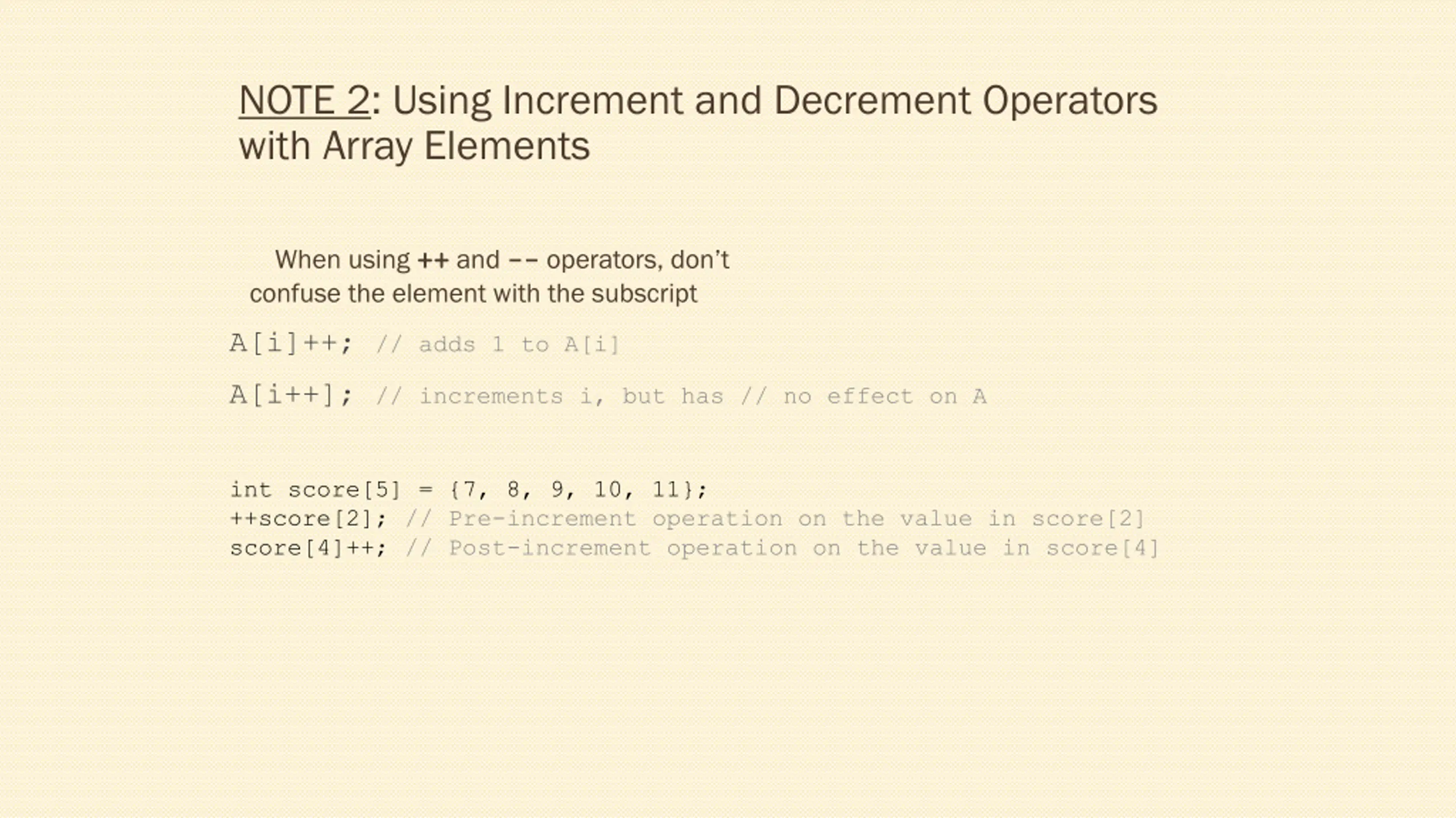 NOTE 2: Using Increment and Decrement Operators with Array Elements confuse the element with the subscript When using ++ and --operators, don t A[i]++; // adds 1 to A[i] A[i++]; // increments i, but has // no effect on A int score[5] = {7, 8, 9, 10, 11}; ++score[2]; // Pre-increment operation on the value in score[2] score[4]++; // Post-increment operation on the value in score[4]