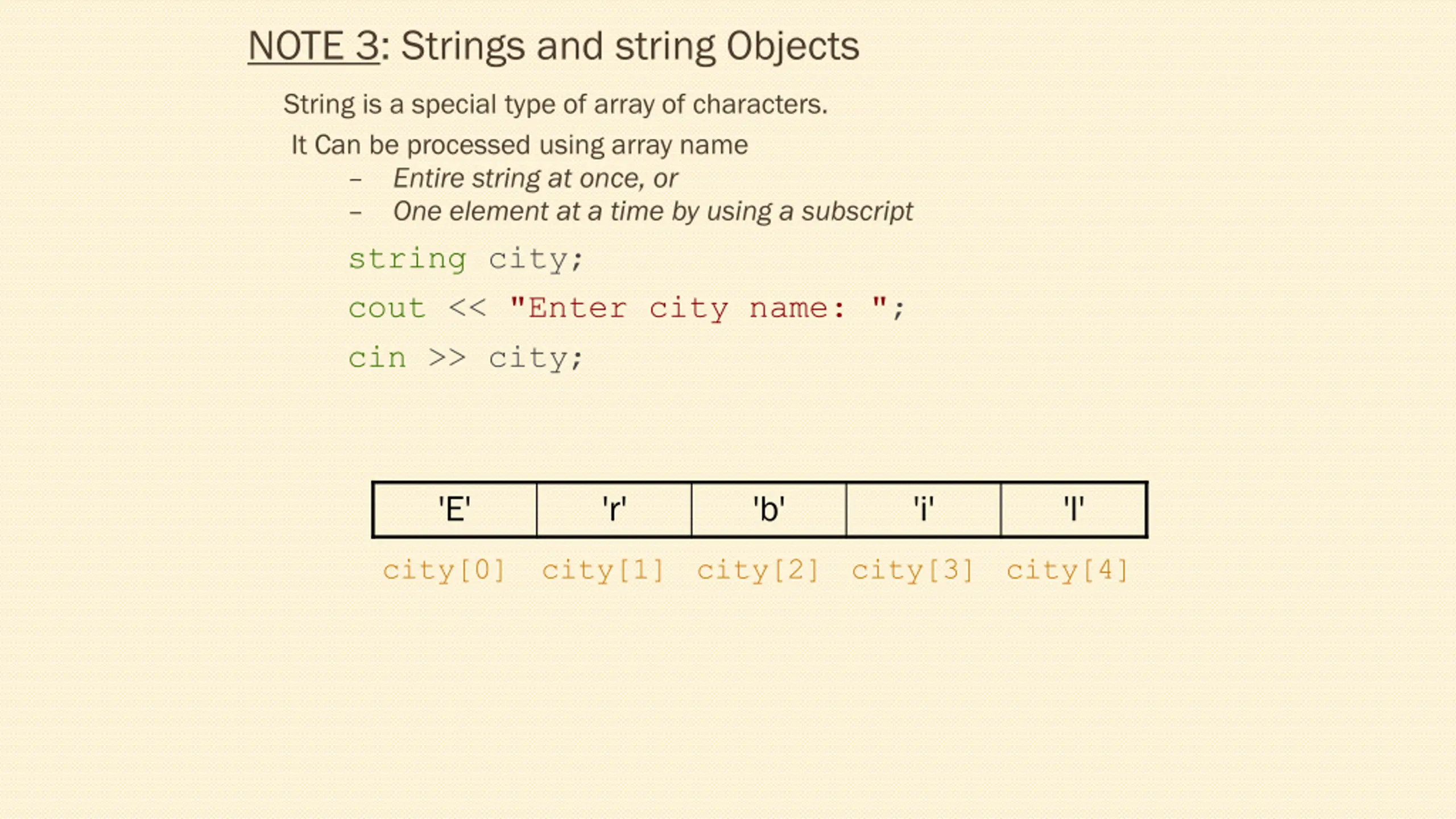 NOTE 3: Strings and string Objects String is a special type of array of characters. It Can be processed using array name Entire string at once, or One element at a time by using a subscript string city; cout << "Enter city name: "; cin >> city; 'E' 'r' 'b' 'i' 'l' city[0] city[1] city[2] city[3] city[4]