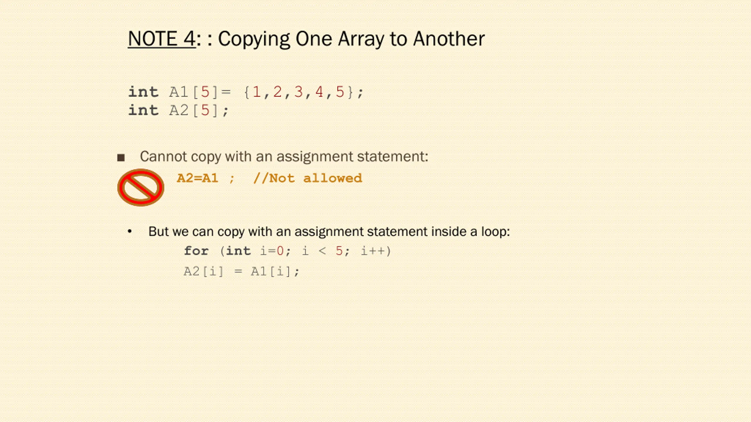 NOTE 4: : Copying One Array to Another int A1[5]= {1,2,3,4,5}; int A2[5]; Cannot copy with an assignment statement: A2=A1 ; //Not allowed But we can copy with an assignment statement inside a loop: for (int i=0; i < 5; i++) A2[i] = A1[i];