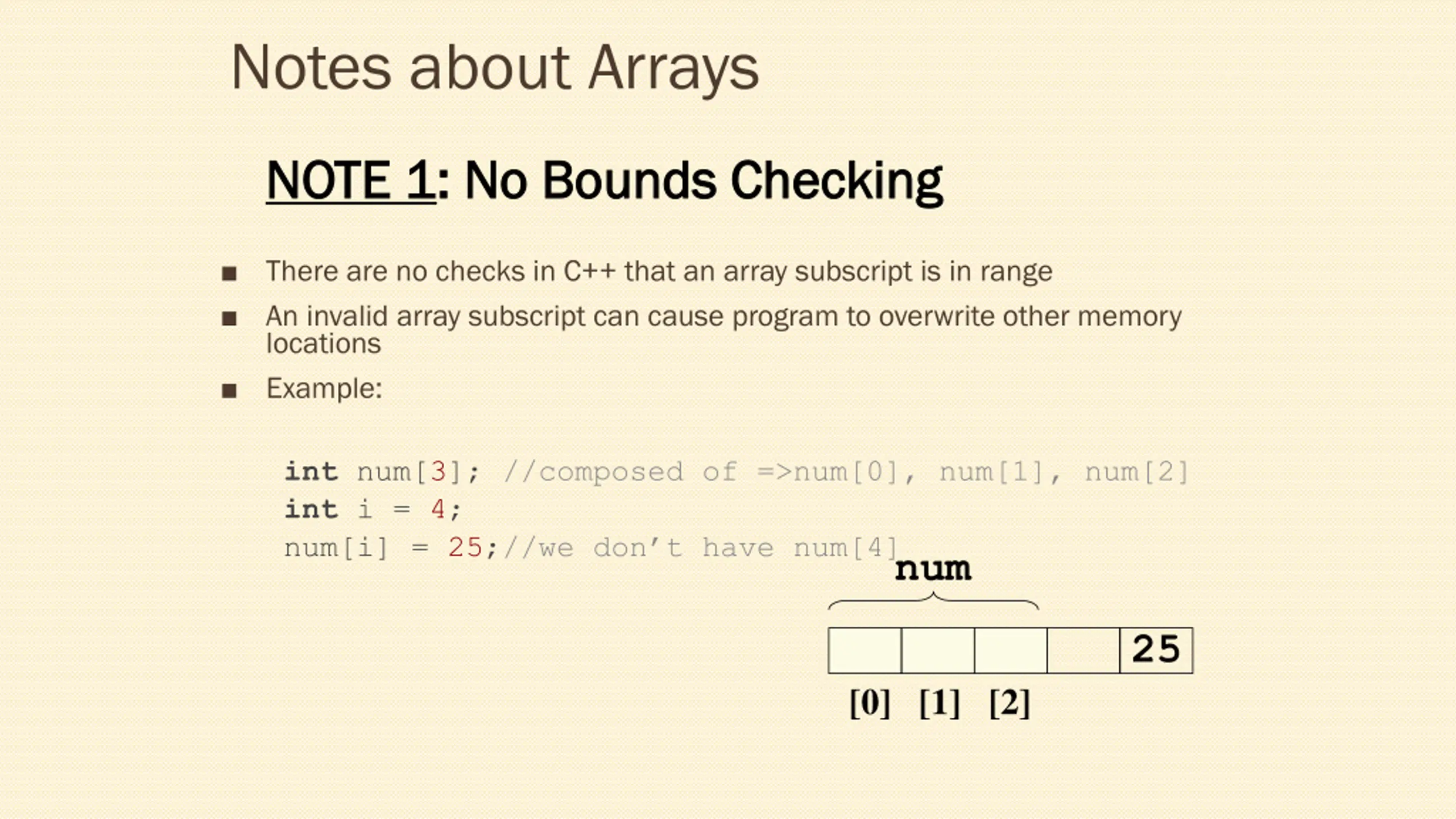 Notes about Arrays NOTE 1 NOTE 1: No Bounds Checking : No Bounds Checking There are no checks in C++ that an array subscript is in range An invalid array subscript can cause program to overwrite other memory locations Example: int num[3]; //composed of =>num[0], num[1], num[2] int i = 4; num[i] = 25;//we don t have num[4]num 25 [0] [1] [2]