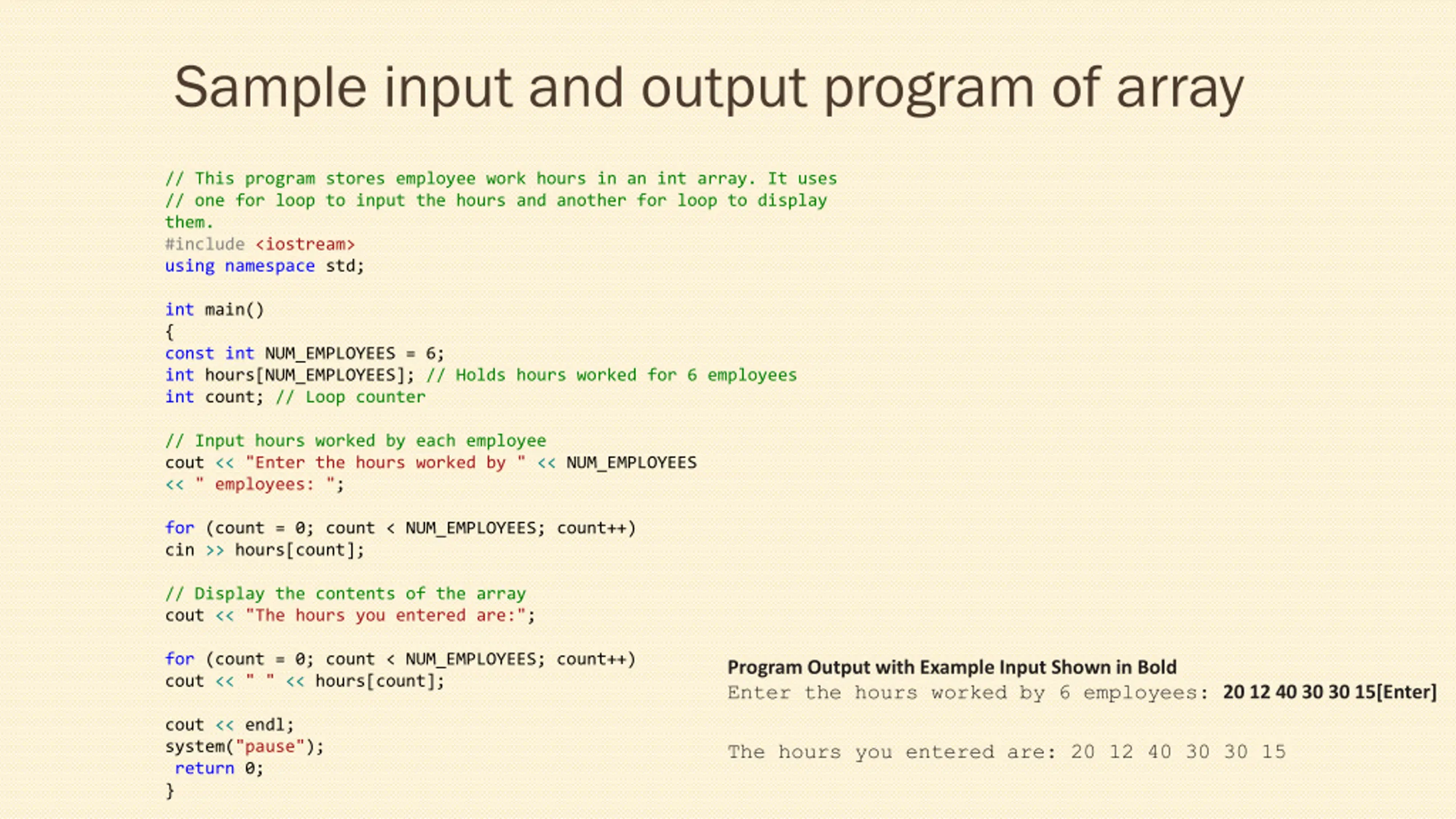 Sample input and output program of array // This program stores employee work hours in an int array. It uses // one for loop to input the hours and another for loop to display them. #include <iostream> using namespace std; int main() { const int NUM_EMPLOYEES = 6; int hours[NUM_EMPLOYEES]; // Holds hours worked for 6 employees int count; // Loop counter // Input hours worked by each employee cout << "Enter the hours worked by " << NUM_EMPLOYEES << " employees: "; for (count = 0; count < NUM_EMPLOYEES; count++) cin >> hours[count]; // Display the contents of the array cout << "The hours you entered are:"; for (count = 0; count < NUM_EMPLOYEES; count++) cout << " " << hours[count]; Program Output with Example Input Shown in Bold Enter the hours worked by 6 employees: 20 12 40 30 30 15[Enter] The hours you entered are: 20 12 40 30 30 15 cout << endl; system("pause"); return 0; }
