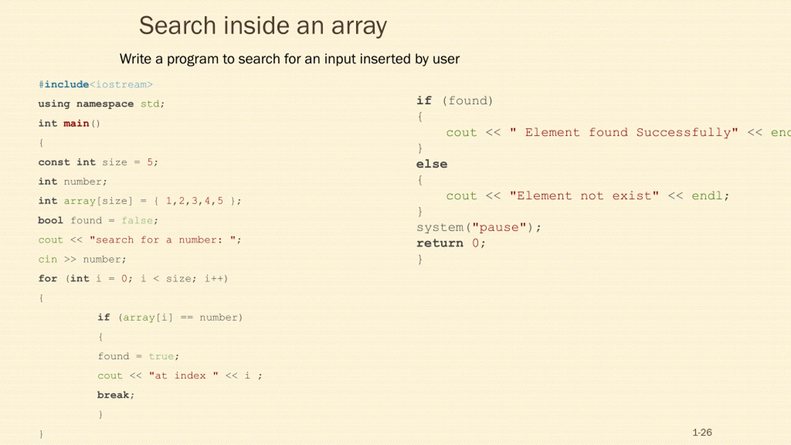 Search inside an array Write a program to search for an input inserted by user #include<iostream> if (found) { cout << " Element found Successfully" << endl } else { cout << "Element not exist" << endl; } system("pause"); return 0; } usingnamespace std; intmain() { constint size = 5; int number; int array[size] = { 1,2,3,4,5 }; bool found = false; cout << "search for a number: "; cin >> number; for (int i = 0; i < size; i++) { if (array[i] == number) { found = true; cout << "at index " << i ; break; } 1-26 }