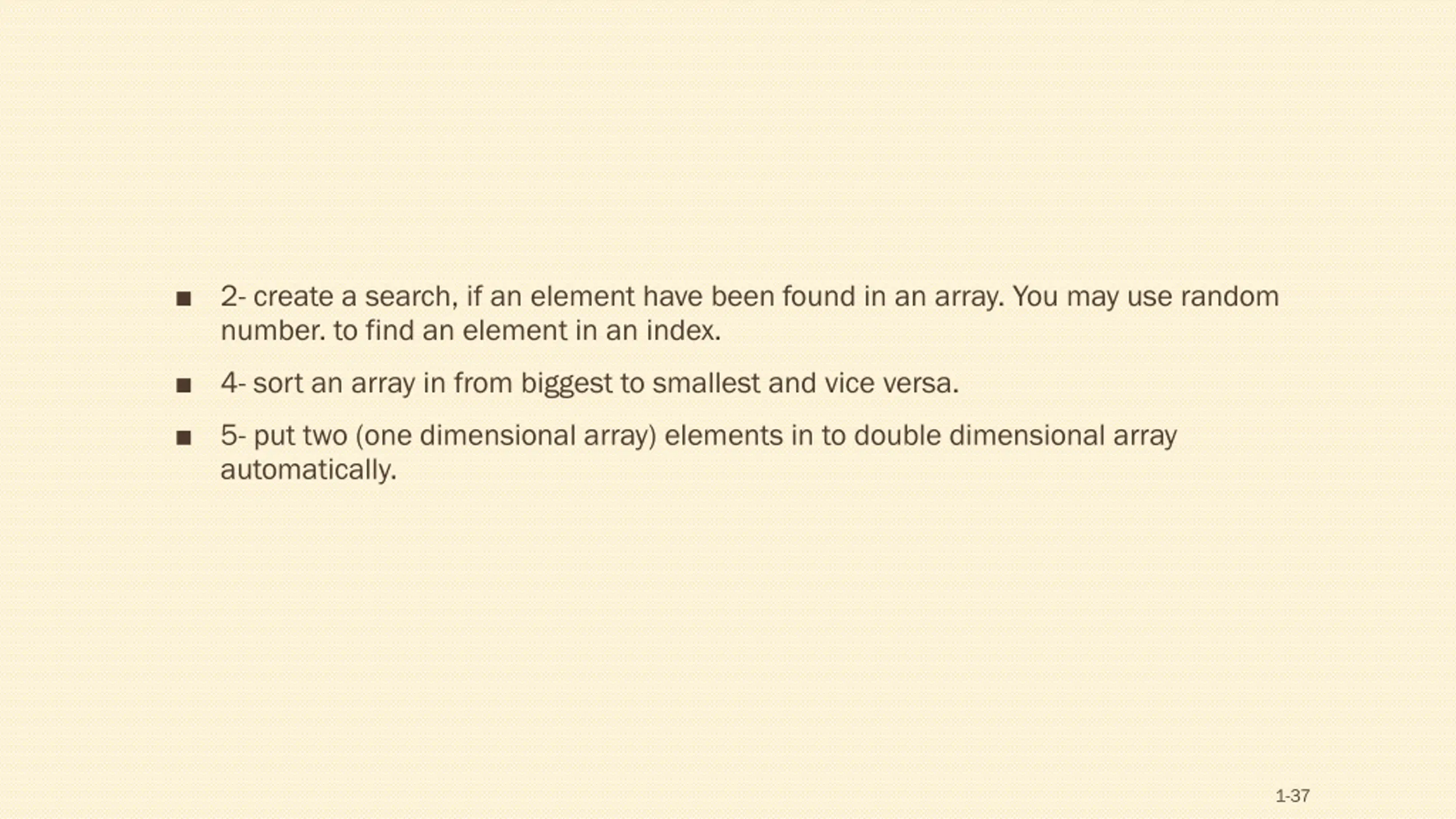2- create a search, if an element have been found in an array. You may use random number. to find an element in an index. 4- sort an array in from biggest to smallest and vice versa. 5- put two (one dimensional array) elements in to double dimensional array automatically. 1-37