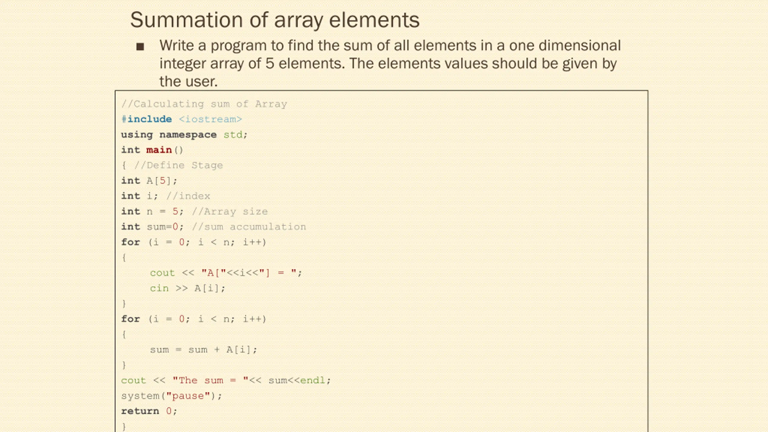 Summation of array elements Write a program to find the sum of all elements in a one dimensional integer array of 5 elements. The elements values should be given by the user. //Calculating sum of Array #include <iostream> usingnamespace std; intmain() { //Define Stage int A[5]; int i; //index int n = 5; //Array size int sum=0; //sum accumulation for (i = 0; i < n; i++) { cout << "A["<<i<<"] = "; cin >> A[i]; } for (i = 0; i < n; i++) { sum = sum + A[i]; } cout << "The sum = "<< sum<<endl; system("pause"); return 0; }