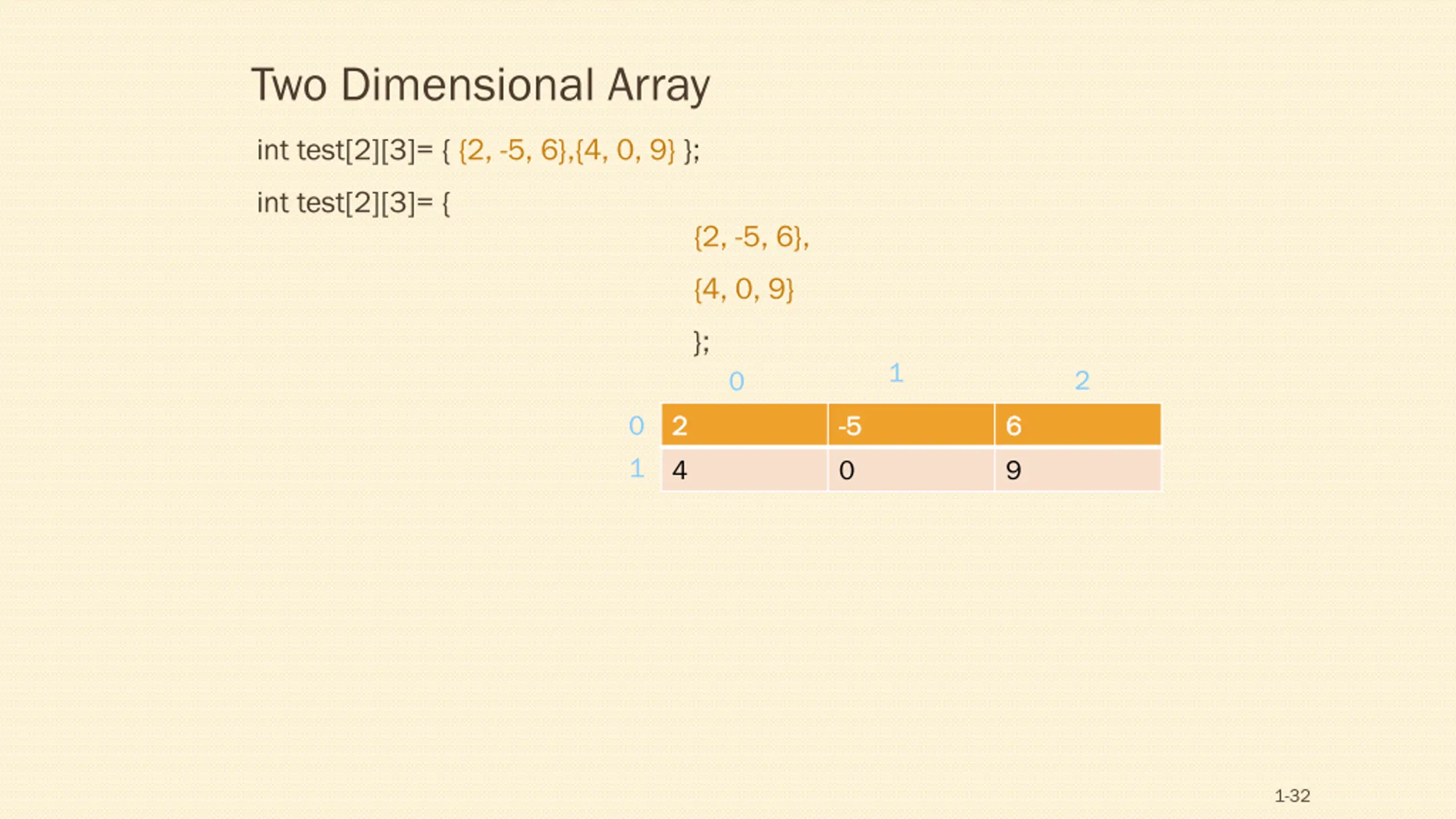 Two Dimensional Array int test[2][3]= { {2, -5, 6},{4, 0, 9} }; int test[2][3]= { {2, -5, 6}, {4, 0, 9} }; 1 2 0 0 1 2 2 4 - -5 5 0 6 6 9 1-32