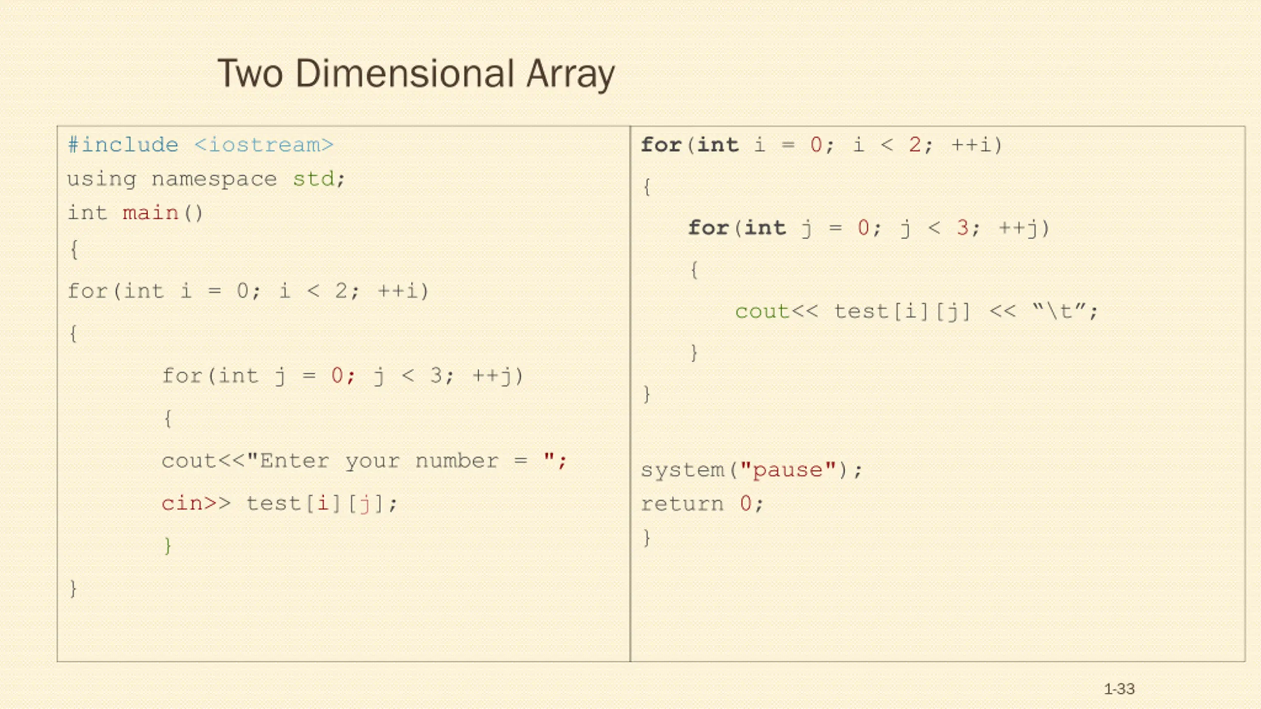 Two Dimensional Array #include <iostream> using namespace std; int main() { for(int i = 0; i < 2; ++i) { for(int j = 0; j < 3; ++j) { for(int i = 0; i < 2; ++i) cout<< test[i][j] << \t ; { } for(int j = 0; j < 3; ++j) } { cout<<"Enter your number = "; system("pause"); return 0; } cin>> test[i][j]; } } 1-33