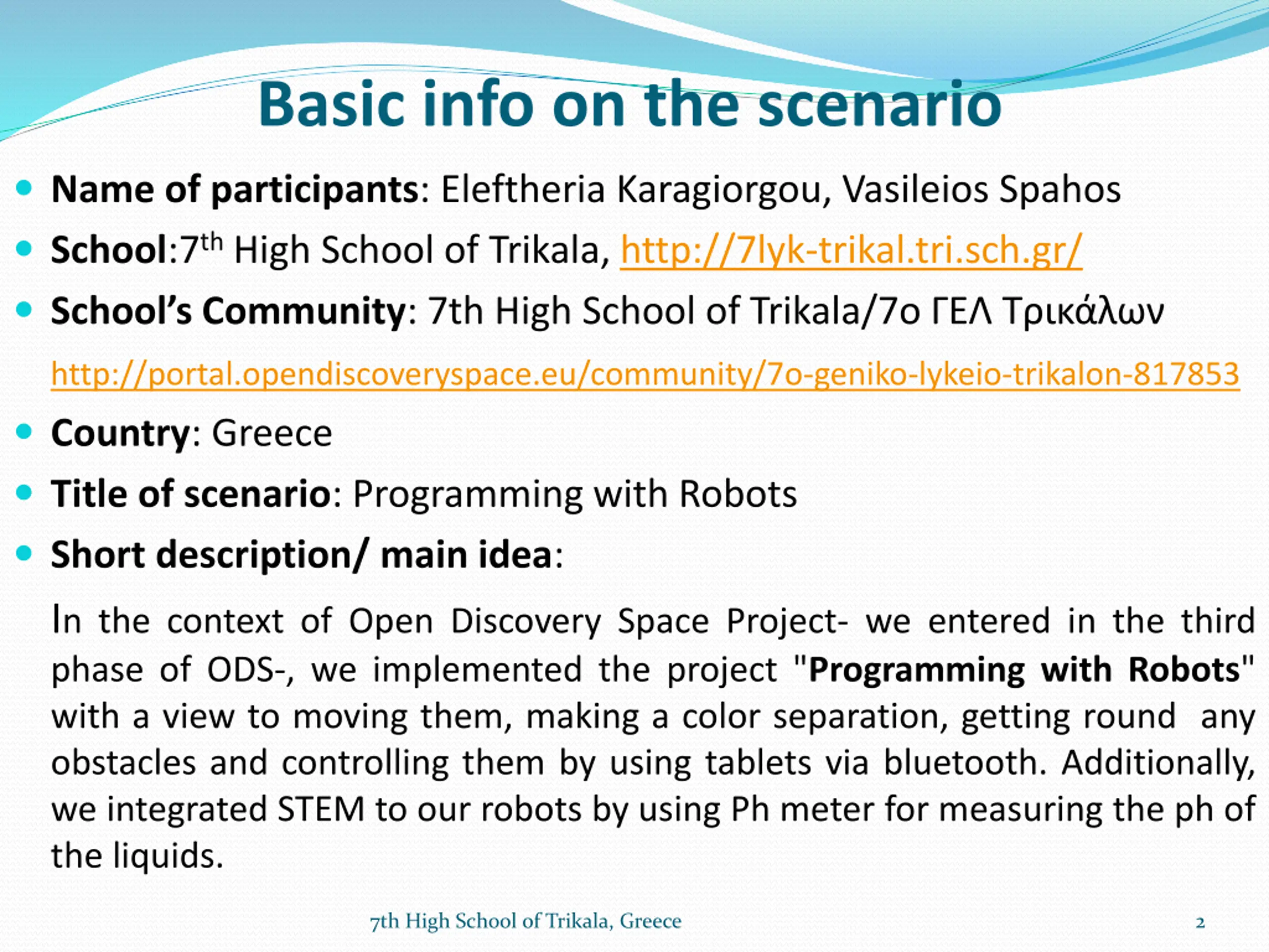 Basic info on the scenario Name of participants: Eleftheria Karagiorgou, Vasileios Spahos School:7thHigh School of Trikala, http://7lyk-trikal.tri.sch.gr/ School s Community: 7th High School of Trikala/7 http://portal.opendiscoveryspace.eu/community/7o-geniko-lykeio-trikalon-817853 Country: Greece Title of scenario: Programming with Robots Short description/ main idea: In the context of Open Discovery Space Project- we entered in the third phase of ODS-, we implemented the project "Programming with Robots" with a view to moving them, making a color separation, getting round any obstacles and controlling them by using tablets via bluetooth. Additionally, we integrated STEM to our robots by using Ph meter for measuring the ph of the liquids. 7th High School of Trikala, Greece 2