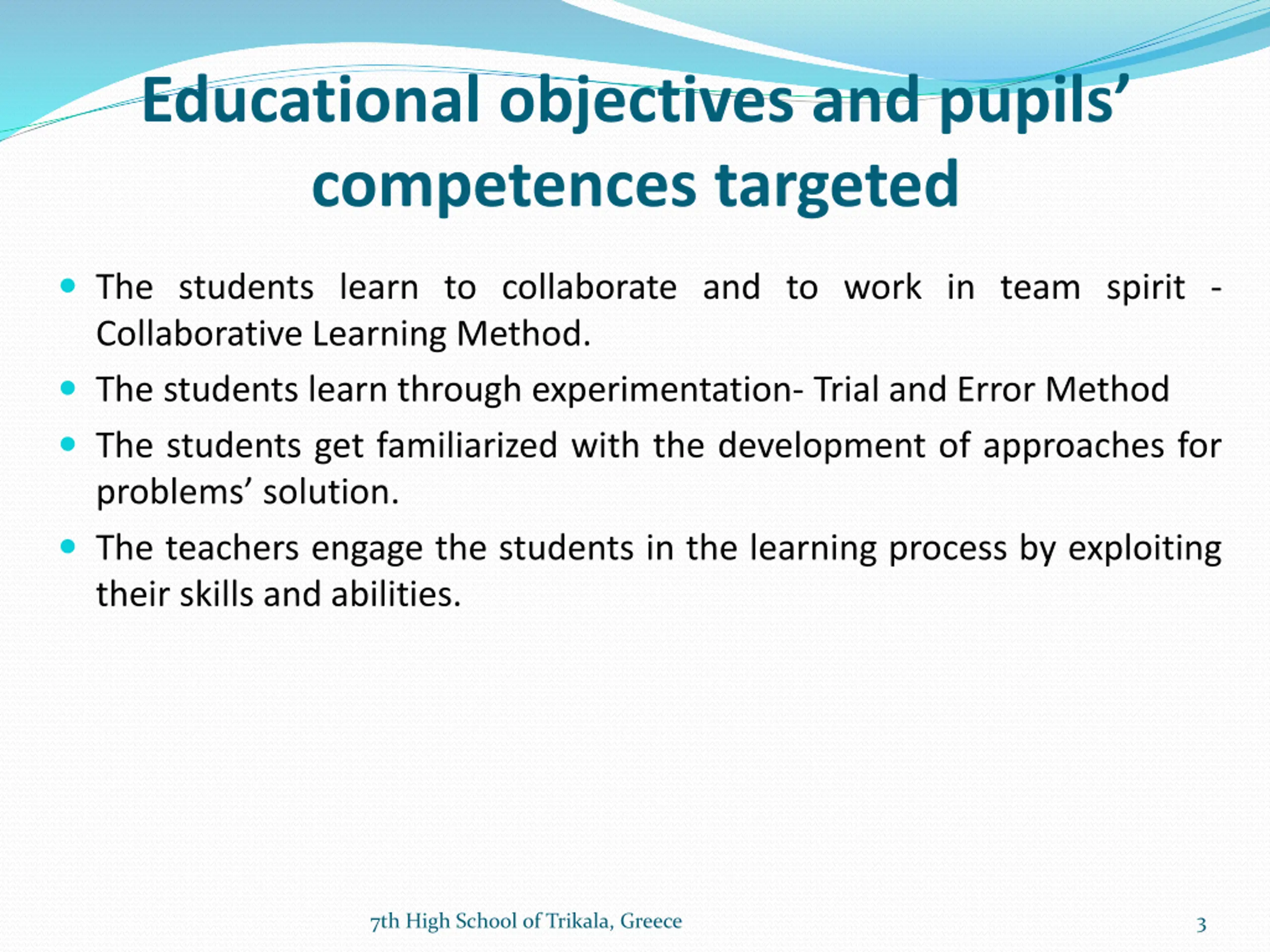 Educational objectives and pupils competences targeted The students learn to collaborate and to work in team spirit - Collaborative Learning Method. The students learn through experimentation- Trial and Error Method The students get familiarized with the development of approaches for problems solution. The teachers engage the students in the learning process by exploiting their skills and abilities. 7th High School of Trikala, Greece 3