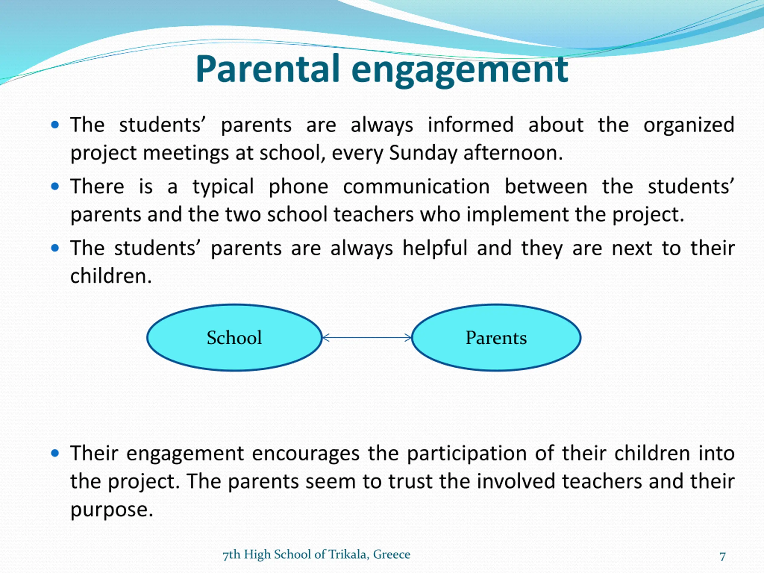 Parental engagement The students parents are always informed about the organized project meetings at school, every Sunday afternoon. There is a typical phone communication between the students parents and the two school teachers who implement the project. The students parents are always helpful and they are next to their children. School Parents Their engagement encourages the participation of their children into the project. The parents seem to trust the involved teachers and their purpose. 7th High School of Trikala, Greece 7