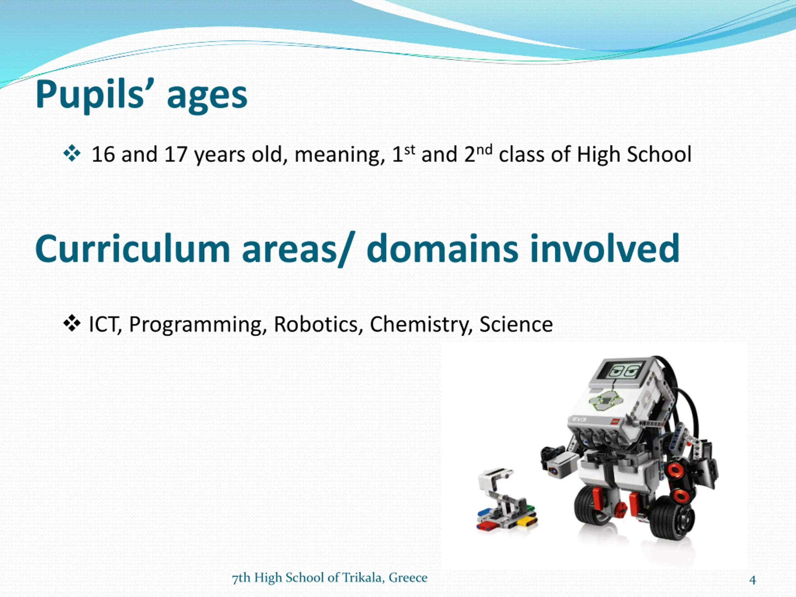 Pupils ages 16 and 17 years old, meaning, 1stand 2ndclass of High School Curriculum areas/ domains involved ICT, Programming, Robotics, Chemistry, Science 7th High School of Trikala, Greece 4