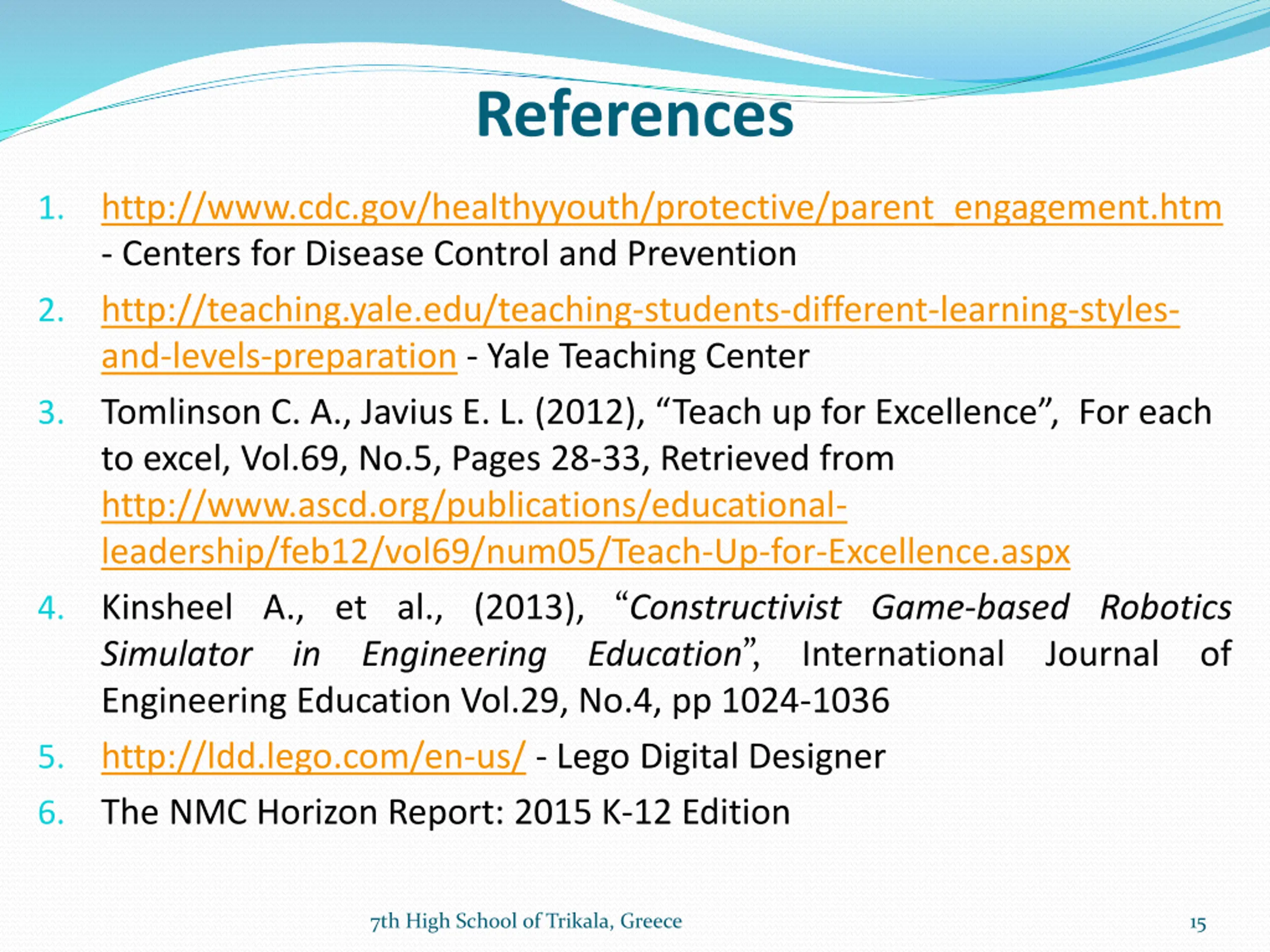References http://www.cdc.gov/healthyyouth/protective/parent_engagement.htm - Centers for Disease Control and Prevention http://teaching.yale.edu/teaching-students-different-learning-styles- and-levels-preparation - Yale Teaching Center Tomlinson C. A., Javius E. L. (2012), Teach up for Excellence , For each to excel, Vol.69, No.5, Pages 28-33, Retrieved from http://www.ascd.org/publications/educational- leadership/feb12/vol69/num05/Teach-Up-for-Excellence.aspx Kinsheel A., et al., (2013), Constructivist Game-based Robotics Simulator in Engineering Education , Engineering Education Vol.29, No.4, pp 1024-1036 http://ldd.lego.com/en-us/ - Lego Digital Designer The NMC Horizon Report: 2015 K-12 Edition 1. 2. 3. 4. International Journal of 5. 6. 7th High School of Trikala, Greece 15