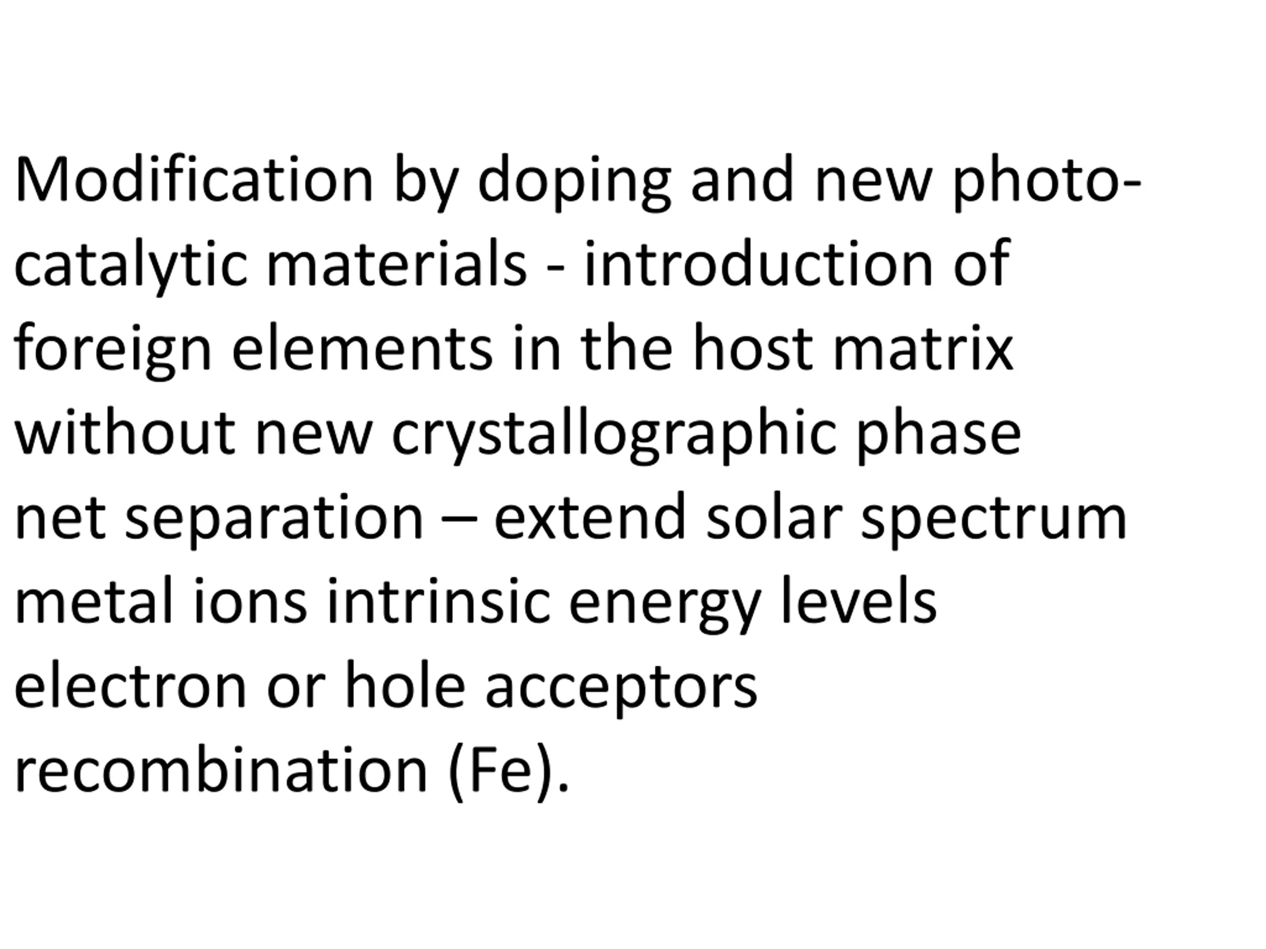 Modification by doping and new photo- catalytic materials - introduction of foreign elements in the host matrix without new crystallographic phase net separation extend solar spectrum metal ions intrinsic energy levels electron or hole acceptors recombination (Fe).