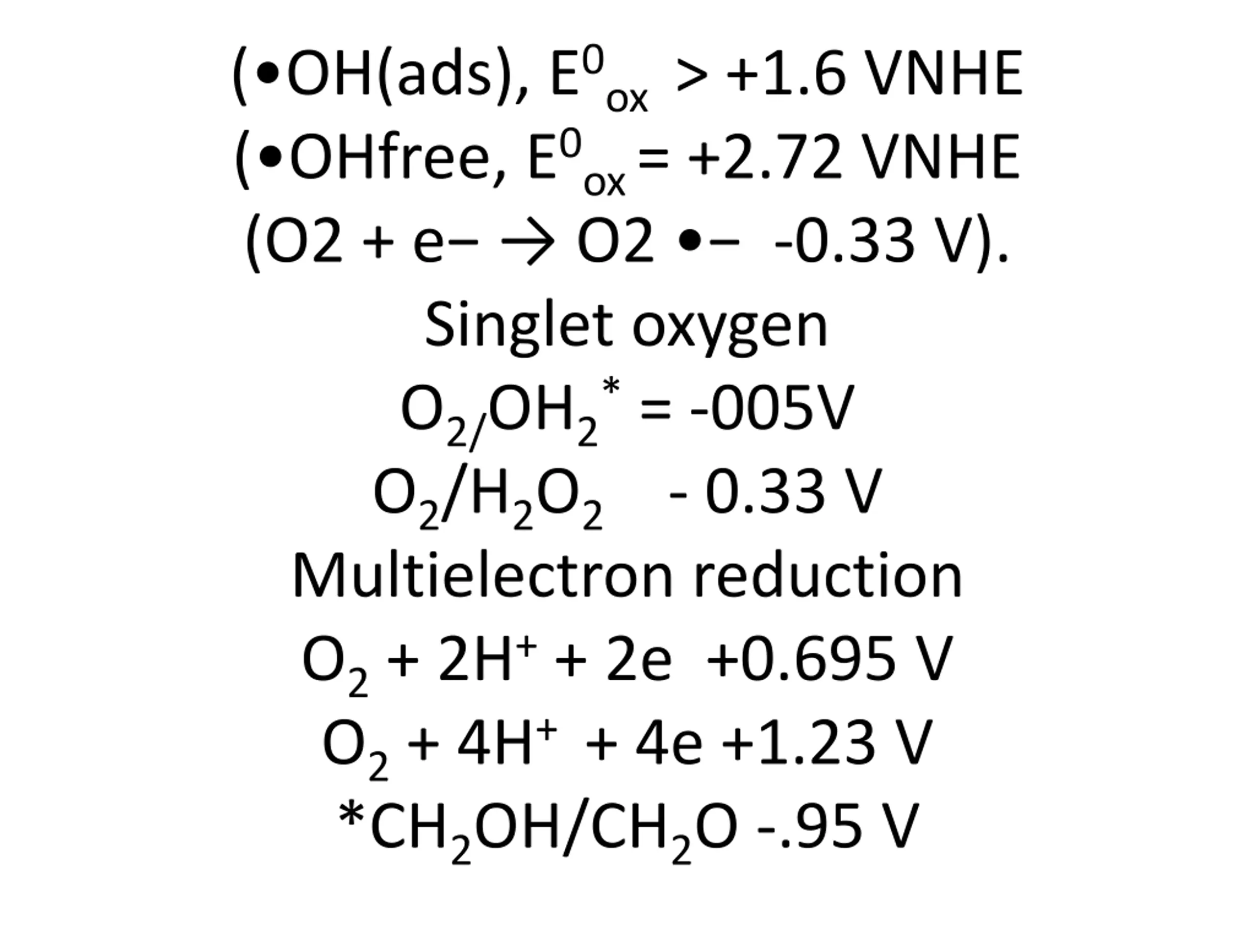 (OH(ads), E0ox > +1.6 VNHE ( OHfree, E0ox = +2.72 VNHE (O2 + e O2 -0.33 V). Singlet oxygen O2/OH2* = -005V O2/H2O2 - 0.33 V Multielectron reduction O2 + 2H+ + 2e +0.695 V O2 + 4H+ + 4e +1.23 V *CH2OH/CH2O -.95 V