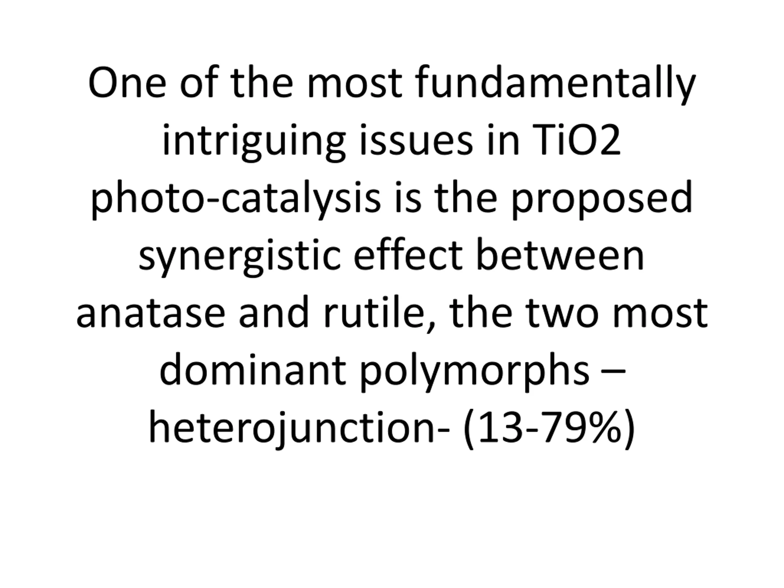 One of the most fundamentally intriguing issues in TiO2 photo-catalysis is the proposed synergistic effect between anatase and rutile, the two most dominant polymorphs heterojunction- (13-79%)