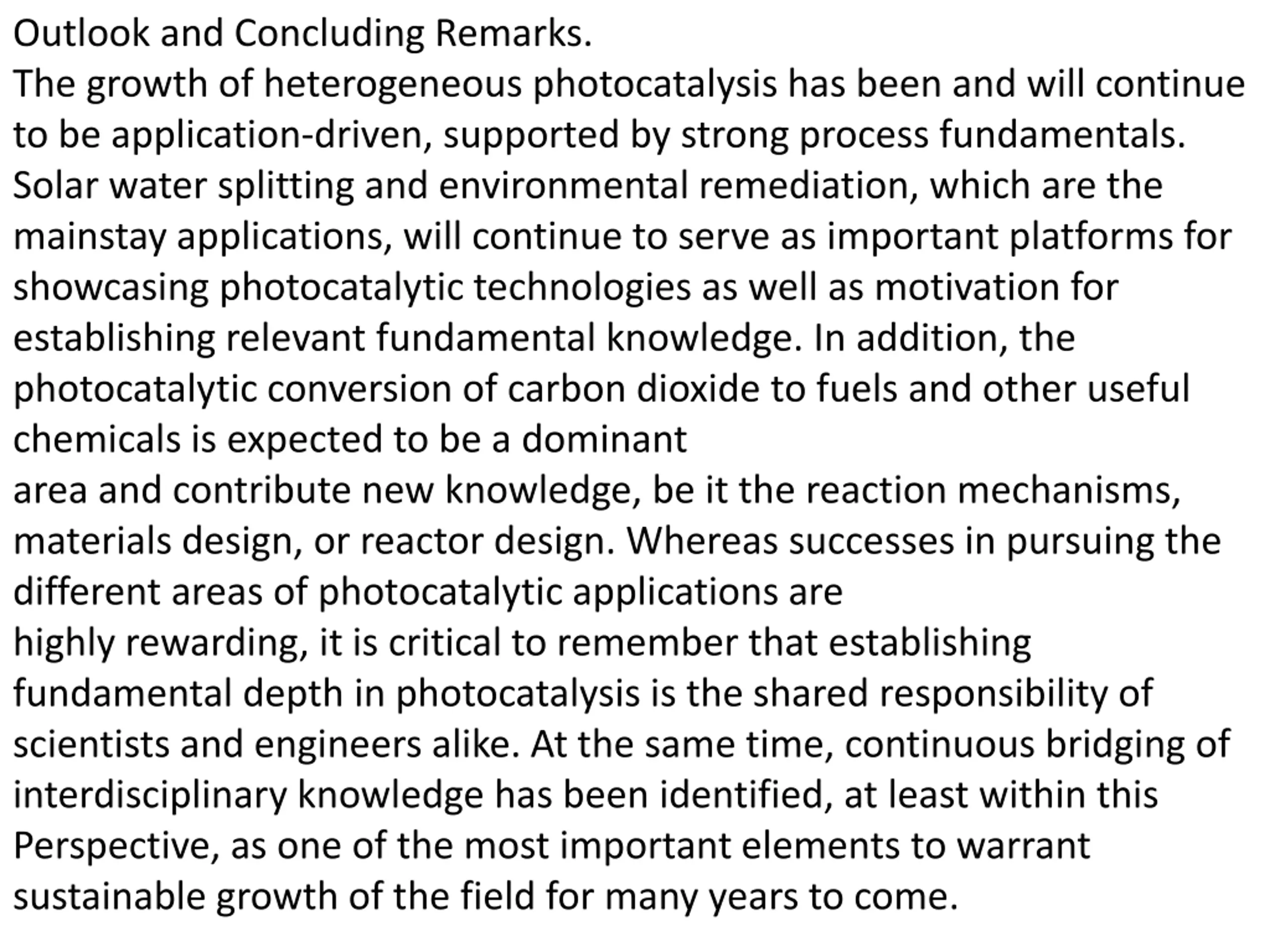 Outlook and Concluding Remarks. The growth of heterogeneous photocatalysis has been and will continue to be application-driven, supported by strong process fundamentals. Solar water splitting and environmental remediation, which are the mainstay applications, will continue to serve as important platforms for showcasing photocatalytic technologies as well as motivation for establishing relevant fundamental knowledge. In addition, the photocatalytic conversion of carbon dioxide to fuels and other useful chemicals is expected to be a dominant area and contribute new knowledge, be it the reaction mechanisms, materials design, or reactor design. Whereas successes in pursuing the different areas of photocatalytic applications are highly rewarding, it is critical to remember that establishing fundamental depth in photocatalysis is the shared responsibility of scientists and engineers alike. At the same time, continuous bridging of interdisciplinary knowledge has been identified, at least within this Perspective, as one of the most important elements to warrant sustainable growth of the field for many years to come.